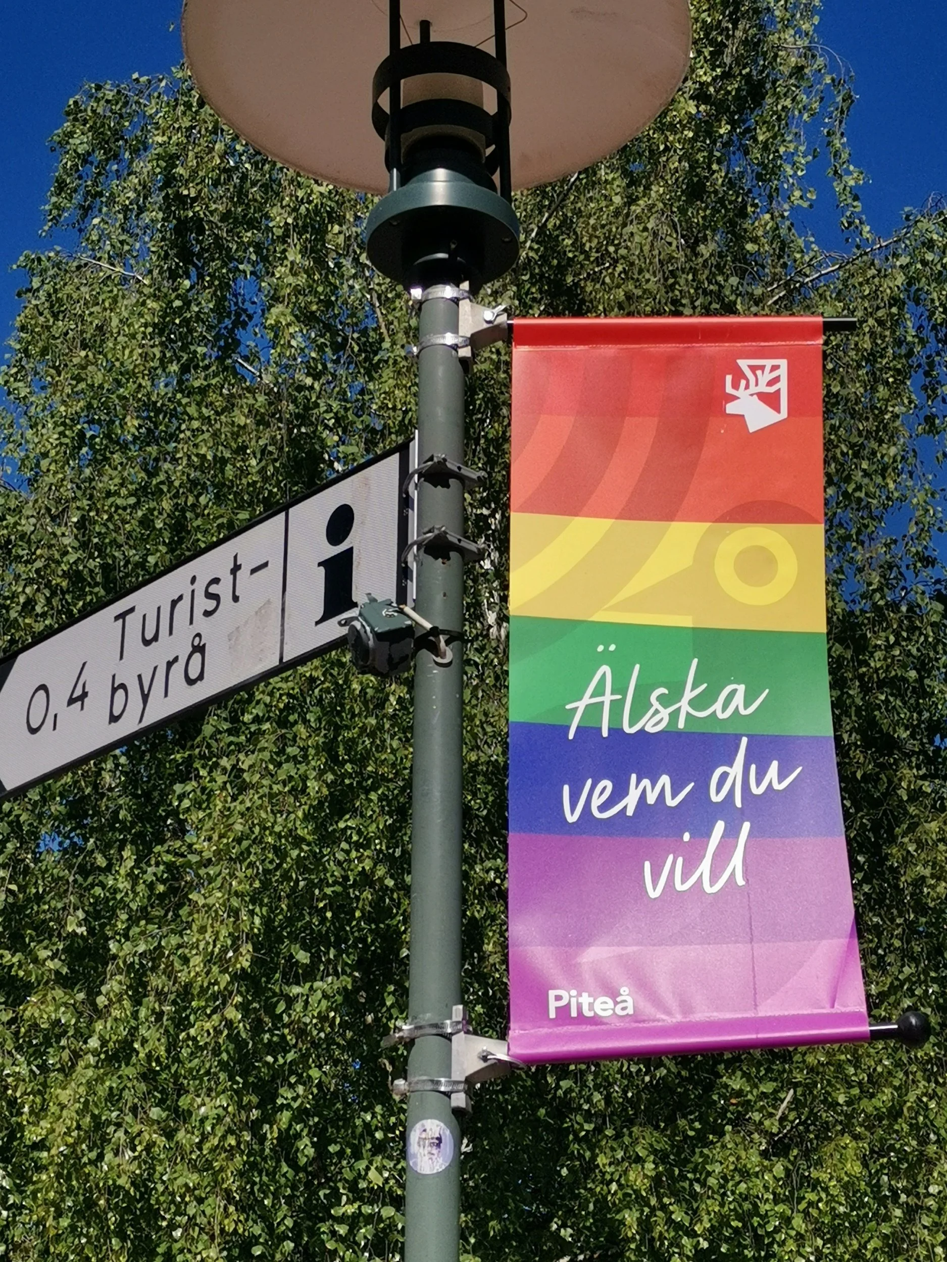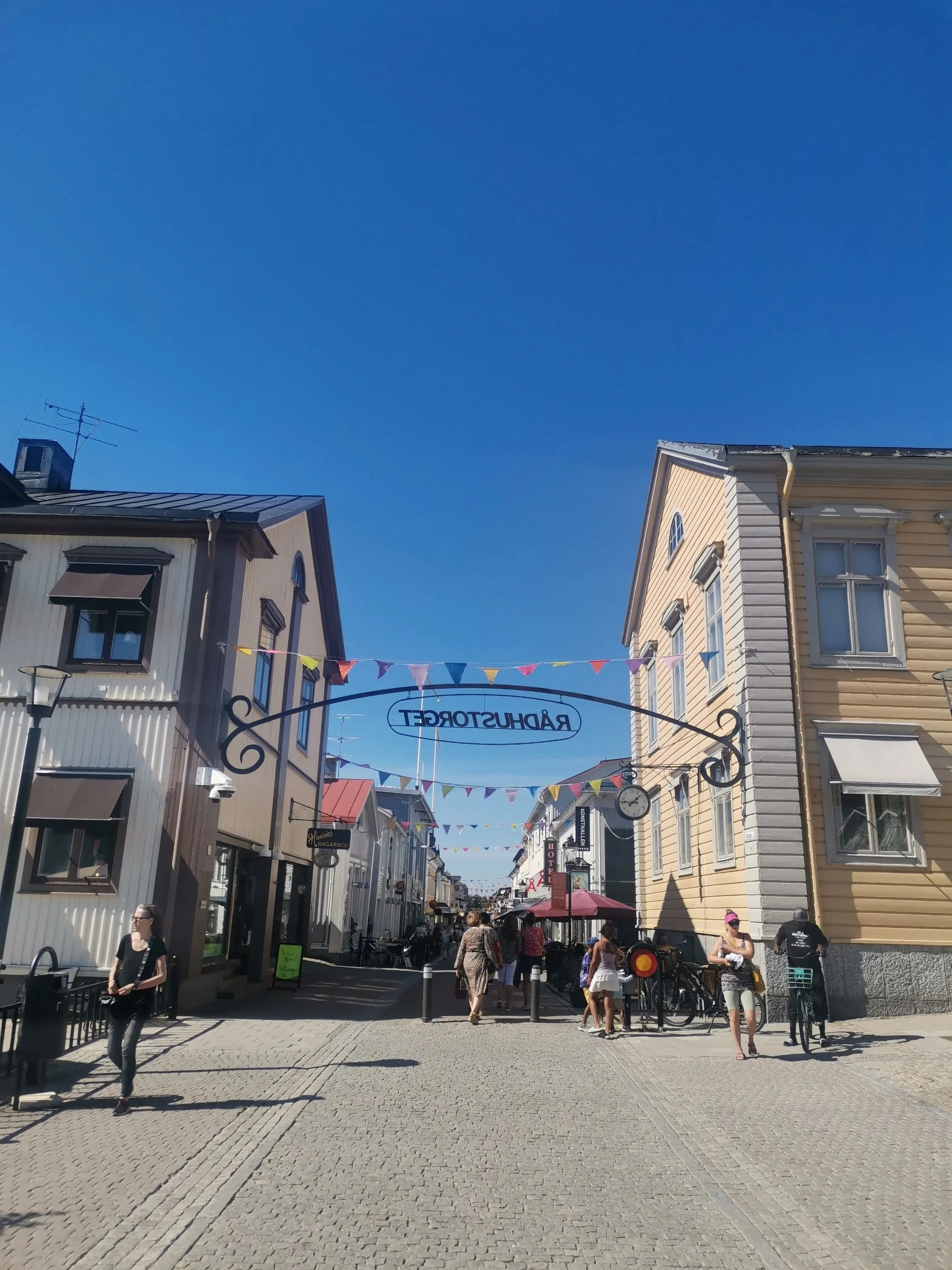 Omsider kjørte vi av mot sentrum av Piteå. Den minste byen for dagen, og det som skulle vise seg å være den absolutt mest trivelige og koselige. Vi fant oss en parkering, og ruslet opp i gågata - som lå perfekt til på et lite høydedrag, og som var pyntet med fargerike, fine bannere på hver sin side av Rådhustorget.