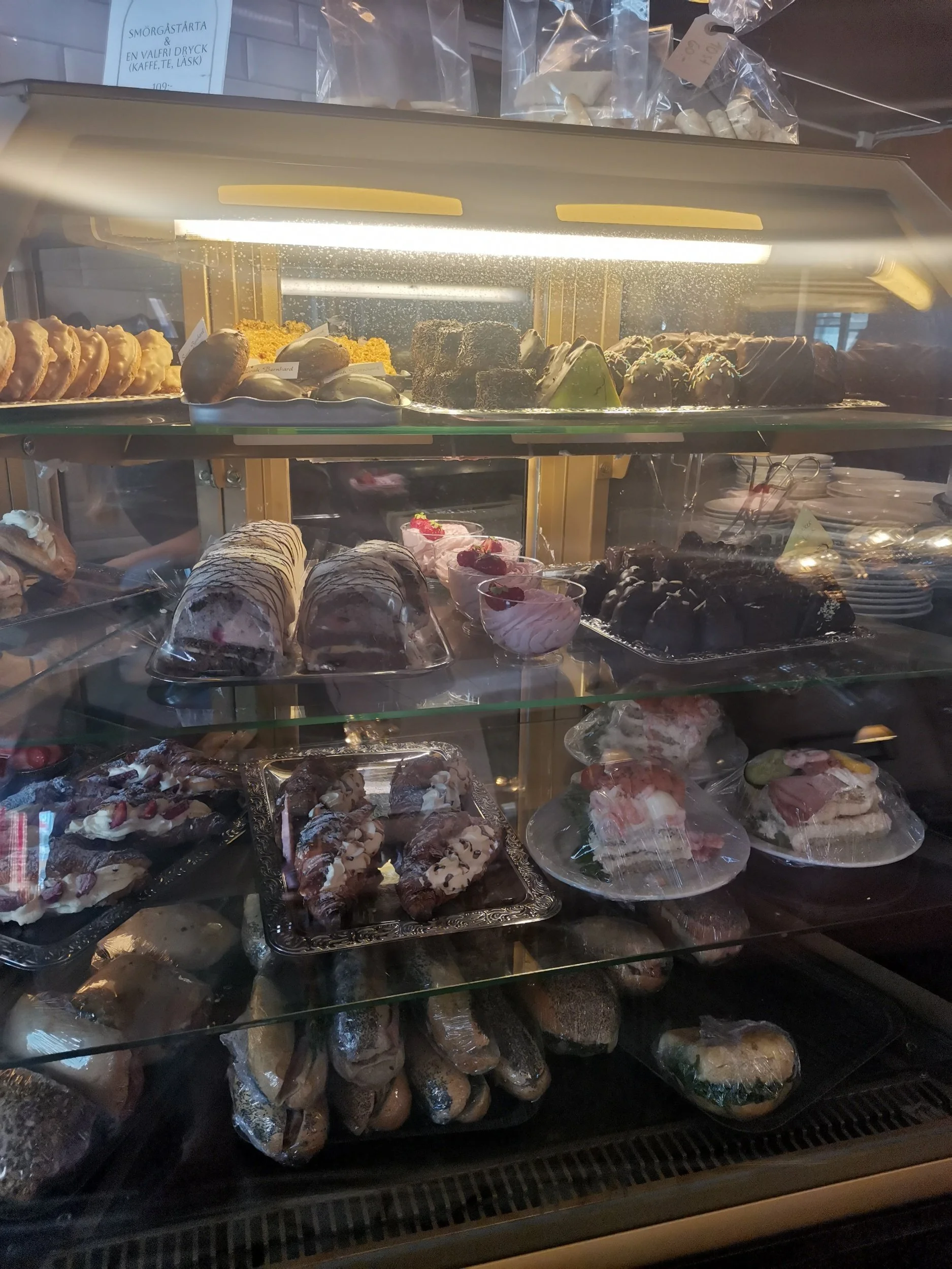 Ett tilbud på disken om Smørgåstårta med valgfritt drikke til 109 svenske kroner fristet. Jeg har aldri smakt smørgåstårta, og det ser jo for så vidt lekkert ut. Jeg hadde garantert likt det også, for jeg elsker jo cabaret. Men er det ikke kakebunn med krem? Altså ikke krem-krem, men noe i samme gata konsistensmessig?
