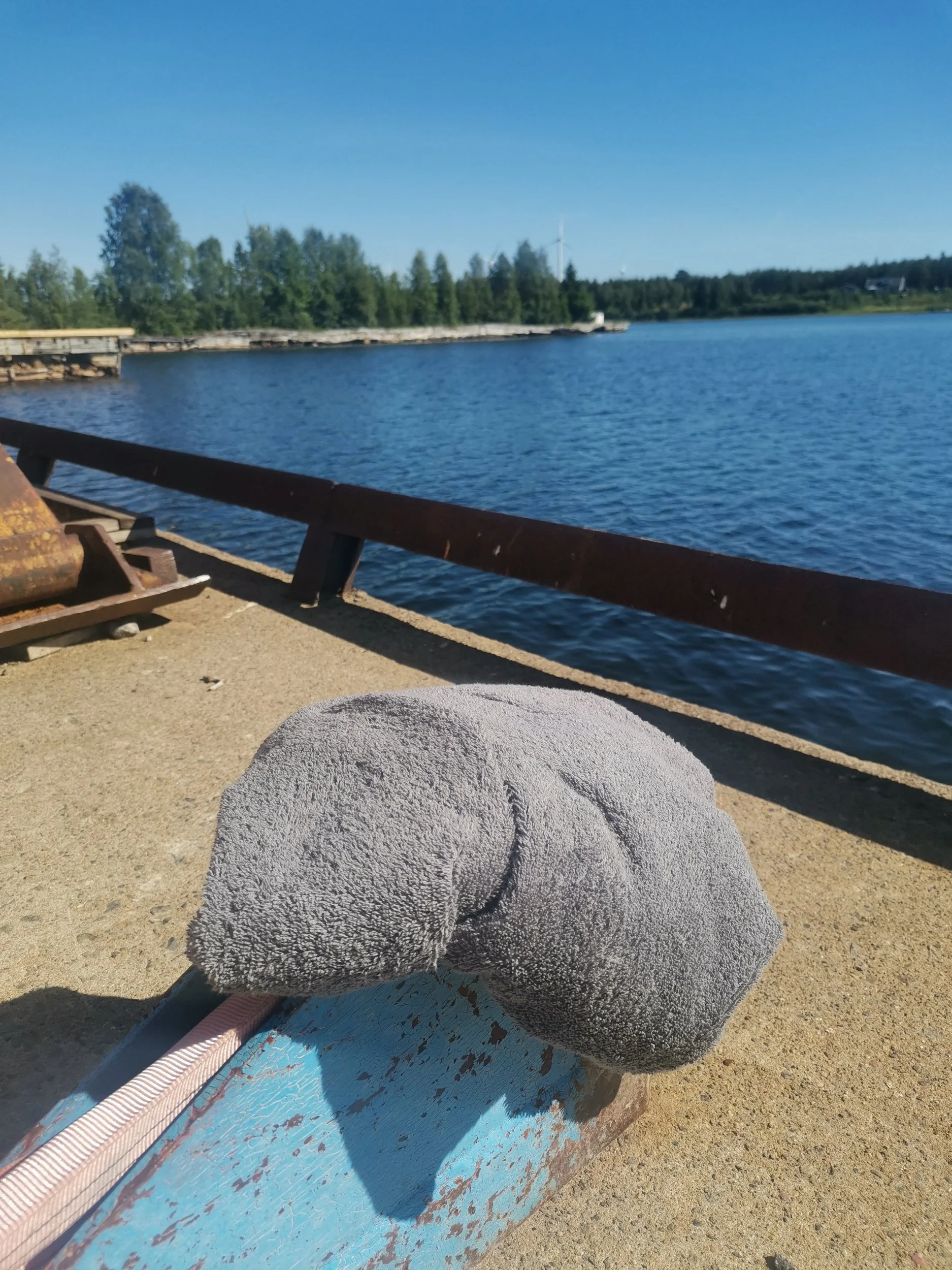 Men hvor var håndkleet til far? Det var sporløst borte. Litt stresset kom jeg plutselig på det. I går, da jeg satt og nøt kveldssola ved kaia rett bortenfor, og så på jentene som fisket. Der la jeg håndkleet mitt i en pen brett under rompa, da jeg satte meg ned på en gammel del av en skinnegang.