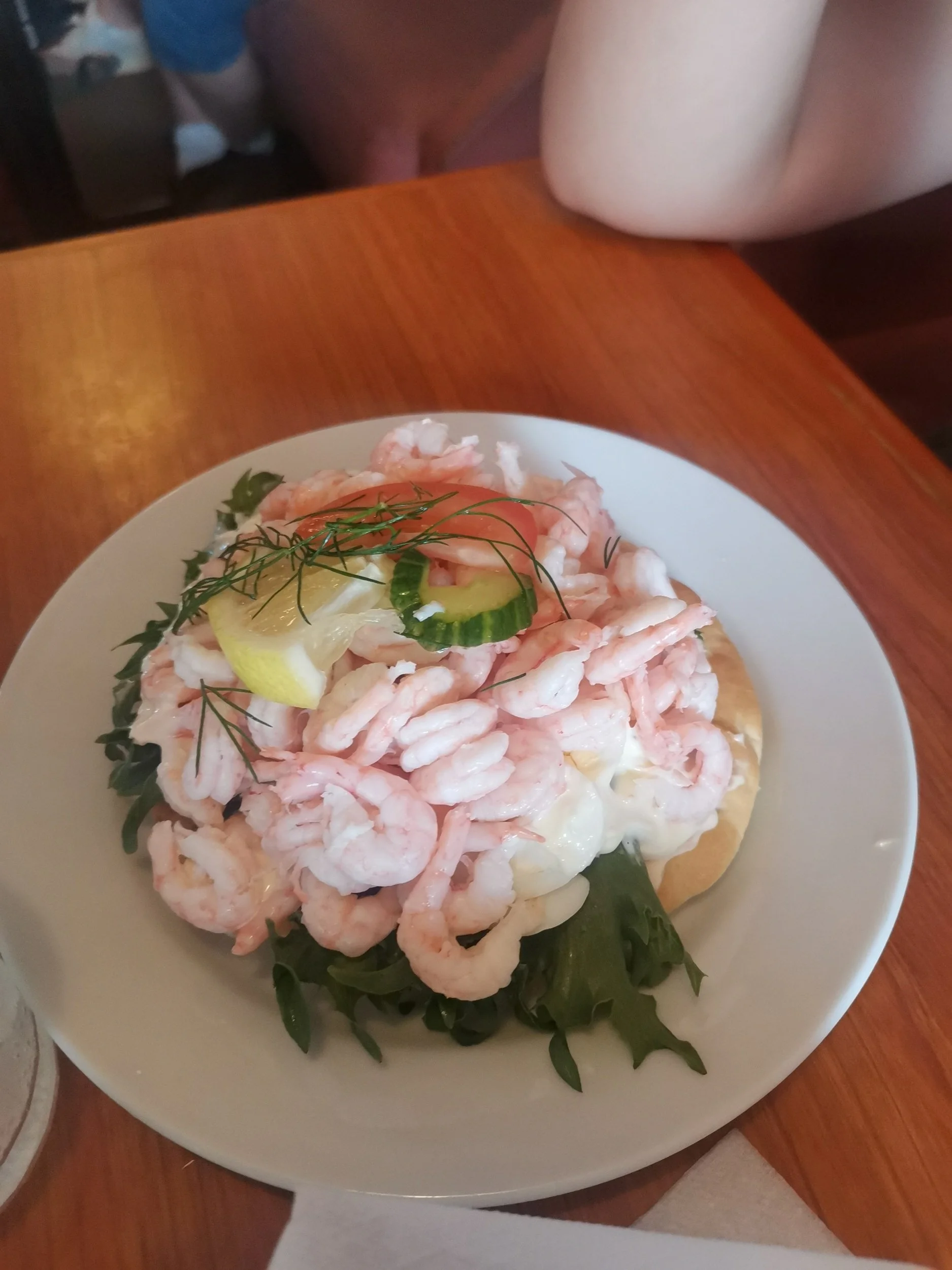 Rekemackan var også fortreffelig. Vi har spist slike før i Sverige. Masse deilige reker med litt egg og majones. Toppet med fersk dill og sitron, og en skive tomat og agurk for syns skyld. Alt dyttet oppå en skive polarbrød, som vi er vant til å kalle det i Norge. Eller Oliverbrød, om du vil - som var Iris sitt navn på dette brødet i en årrekke som yngre.