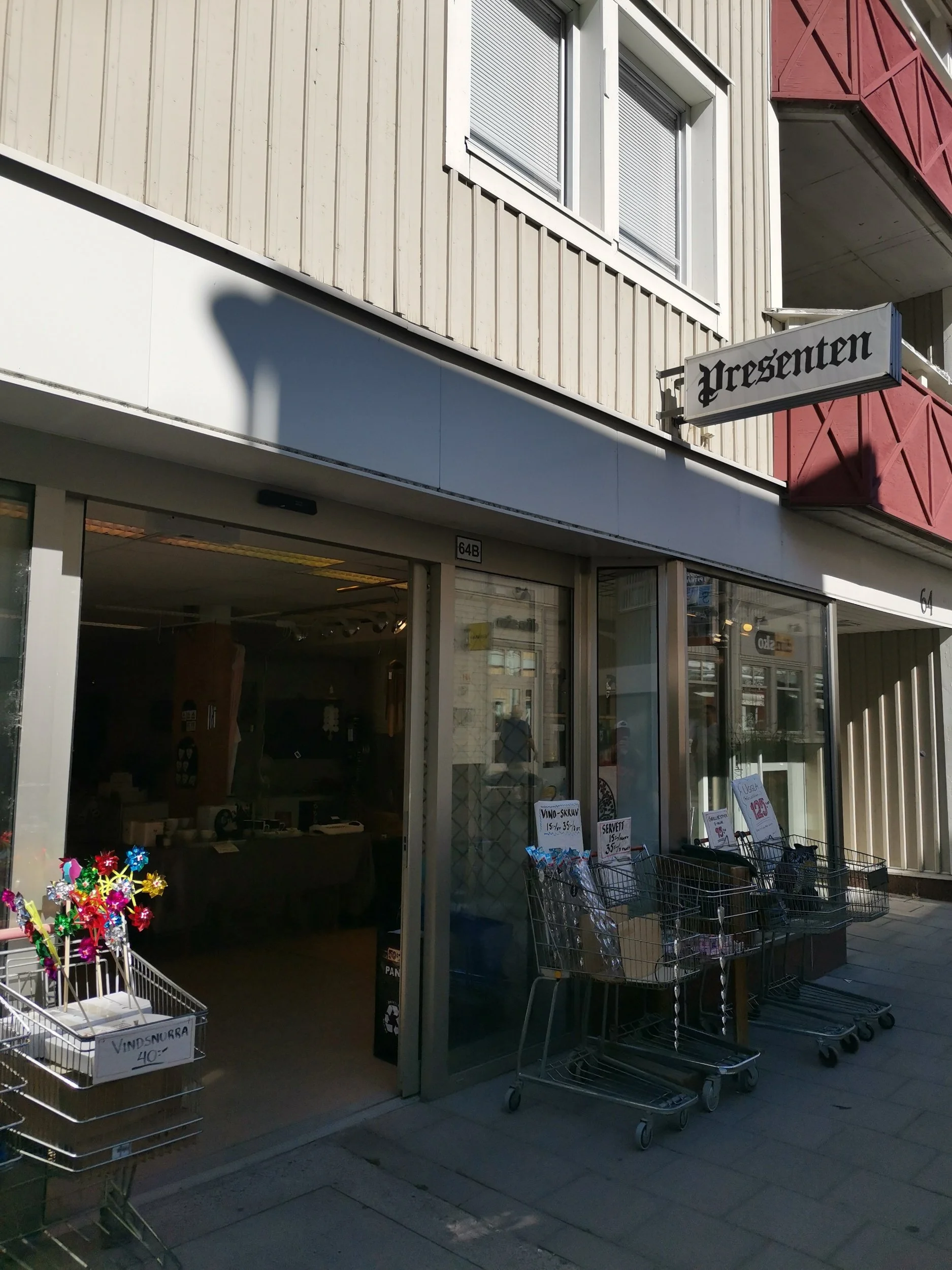 Vi styrte glatt unna de vante kjedebutikkene, og - også her - de uttallige optikerne på vår ferd videre nedover (eller oppover, alt ettersom) gågata. Neste butikk som ropte vårt navn, var en snodig liten butikk som het “Presenten”. Her jobbet det en gammel skrotnisse, som så ut som en blanding av nettopp Skrotnisse - fra den gamle SVT-serien - og Fritjof Arngren. Han med de flyvende bilene, vet du, og de spaca katalogene og nettsidene.