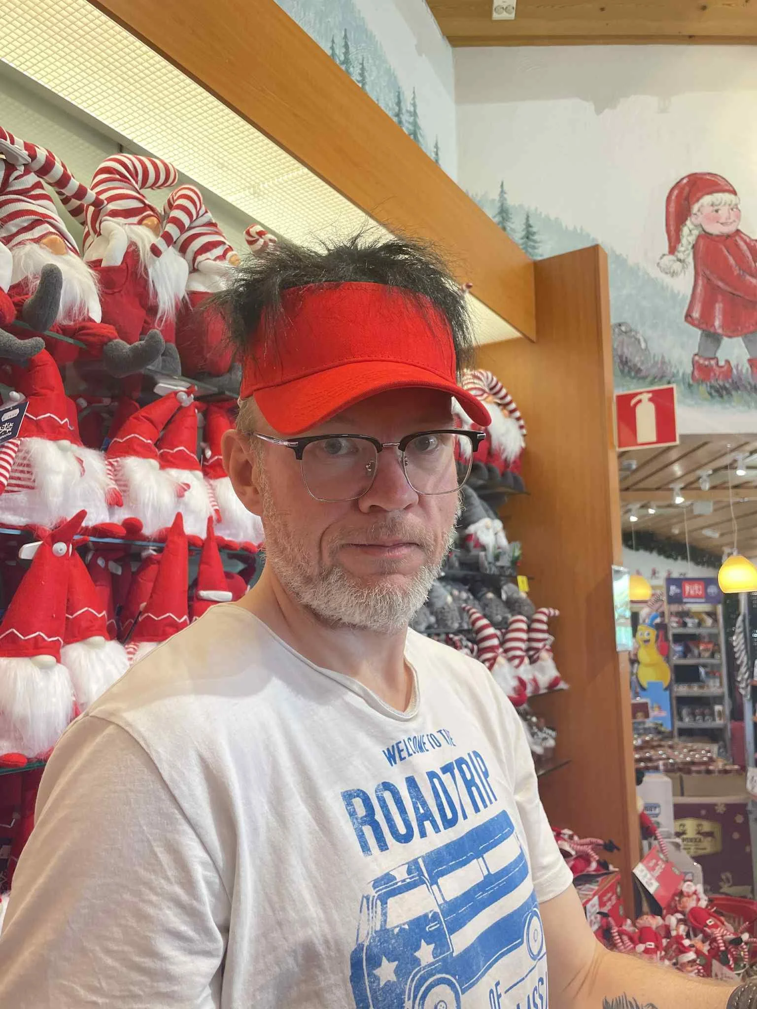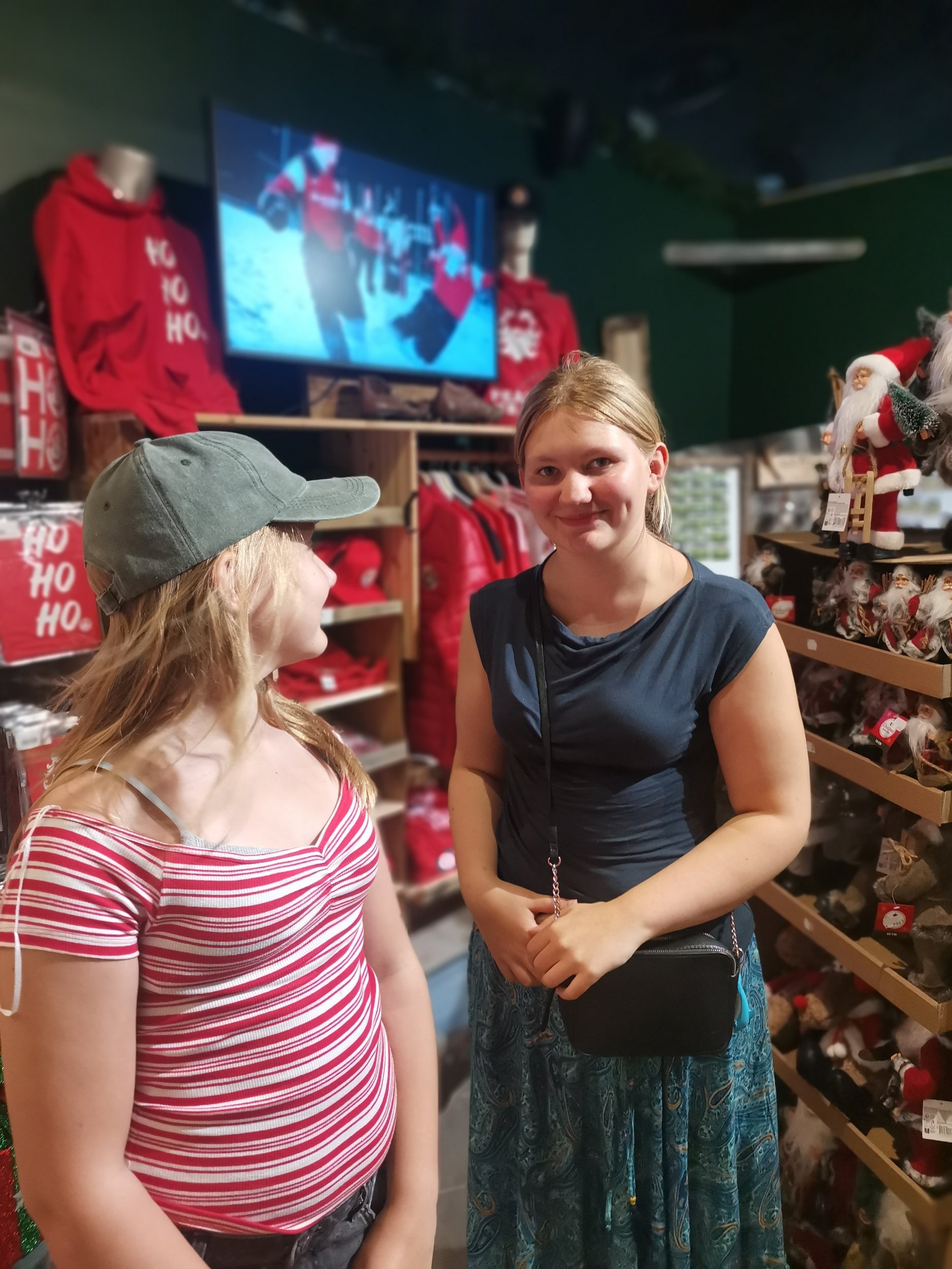 Vi ble vinket inn alle som en, og plassert på hver vår side av ham. Nissen snakket gebrokkent engelsk, og spurte hvor i Norge vi var fra. Lillehammer, svarte vi. Nissen nikket, og hjelperen tok tre bilder. Så ble vi viftet vekk av krakken vi satt på, og rutet inn ei dør, der vi fikk beskjed om å vente ett minutt - så ville bildet snart være klart, og 45 Euro tappet av Mastercardet.