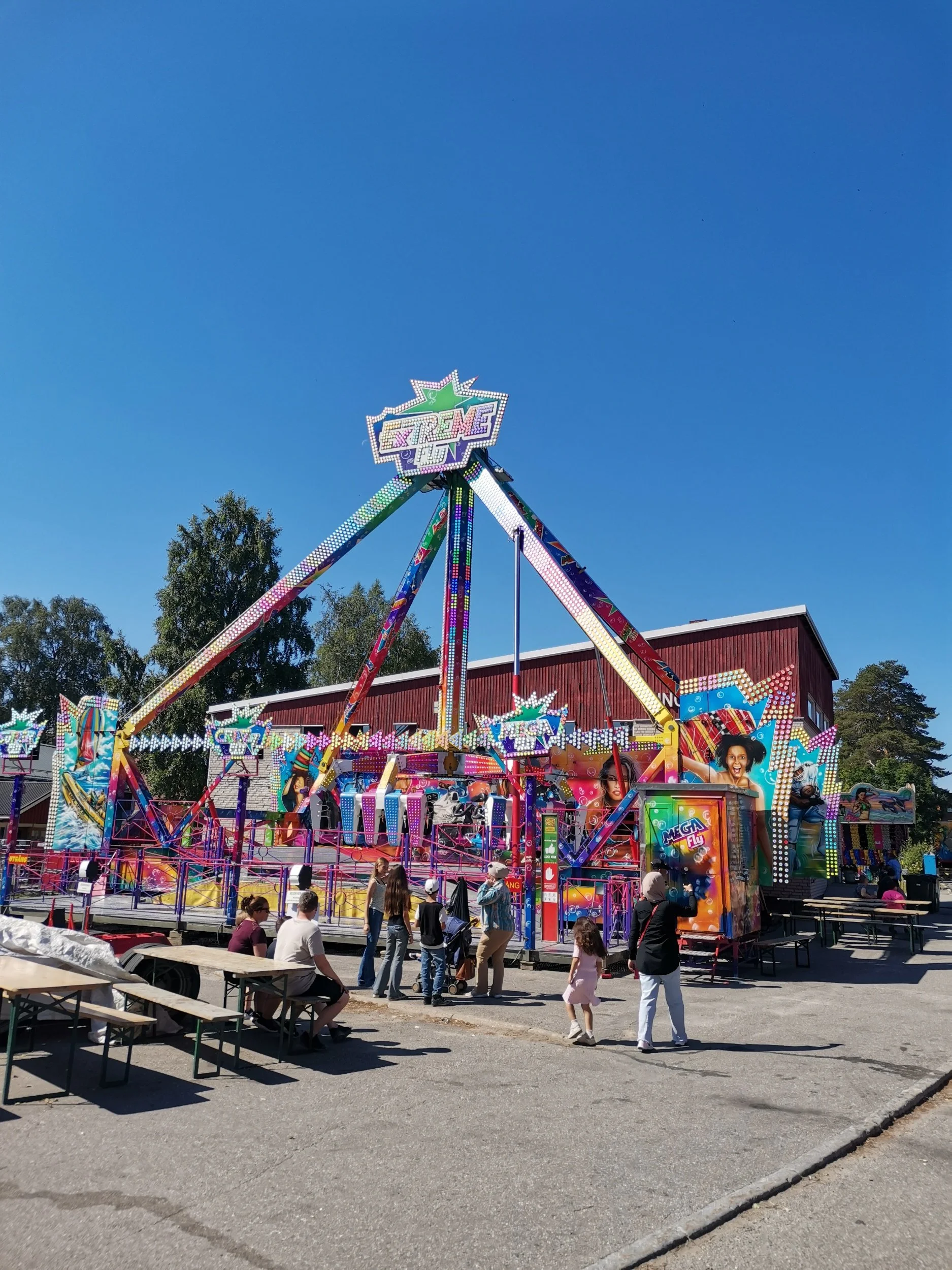 Iris var ikke hypp, og Evelin ville egentlig kun ta spøkelseshuset. Jeg tenkte det sikkert ville være minst like varmt som i beltevogna, og var egentlig heller ikke så hypp sjæl. “Du kan jo ta den alene, så venter vi her”. Jeg ville heller ikke risikere å bli sittende fast i ei av de smale trappene mellom planene på lastebilen. Jeg mener å huske en slik episode fra gammelt av.