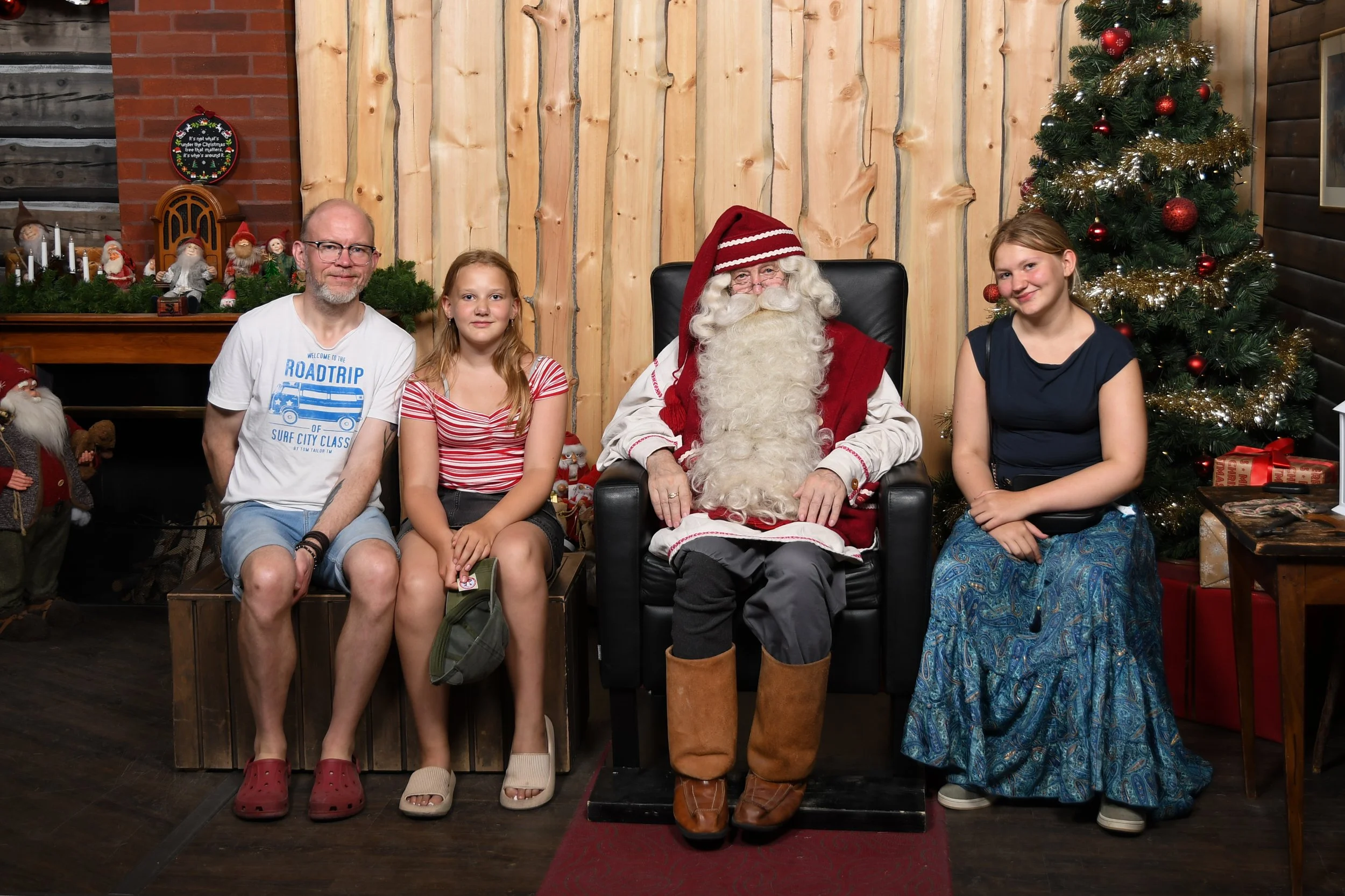 Det første vi gjorde var å rusle i retning julenissen. Her var det absolutt ingen kø, og vi kunne valse helt frem til døra, for så å bli sluppet inn av en av hans gode hjelpere. Det var svalt og godt inne hos nissen. Han hadde gode arbeidsforhold med god aircondition i varmen, og det skulle bare mangle habitten tatt i betraktning. Det begynte å nærme seg arbeidsdagen slutt, så det virket som han ville bli fort ferdig med de tre som plutselig hadde banet seg frem like før han lot drakta falle.