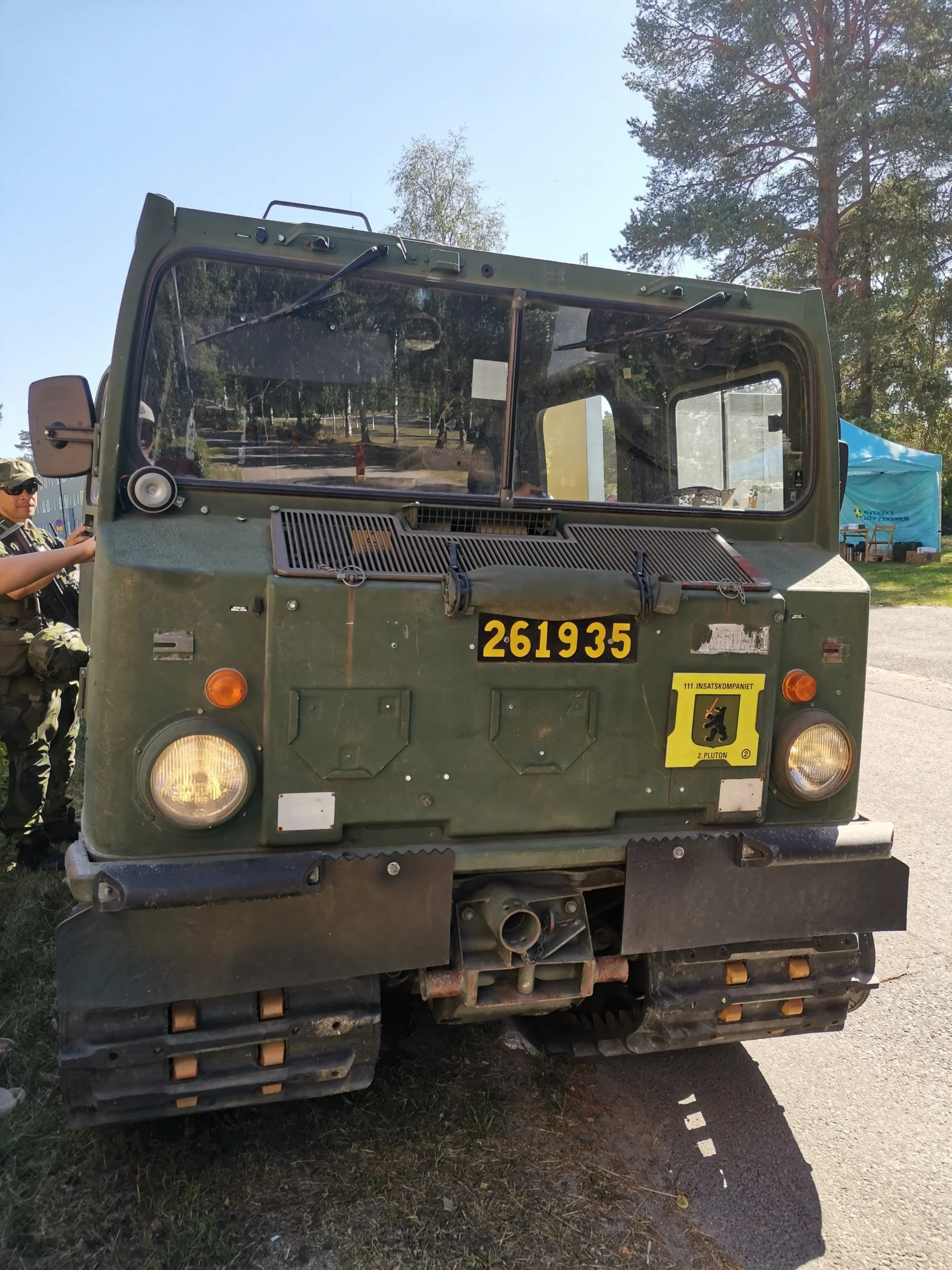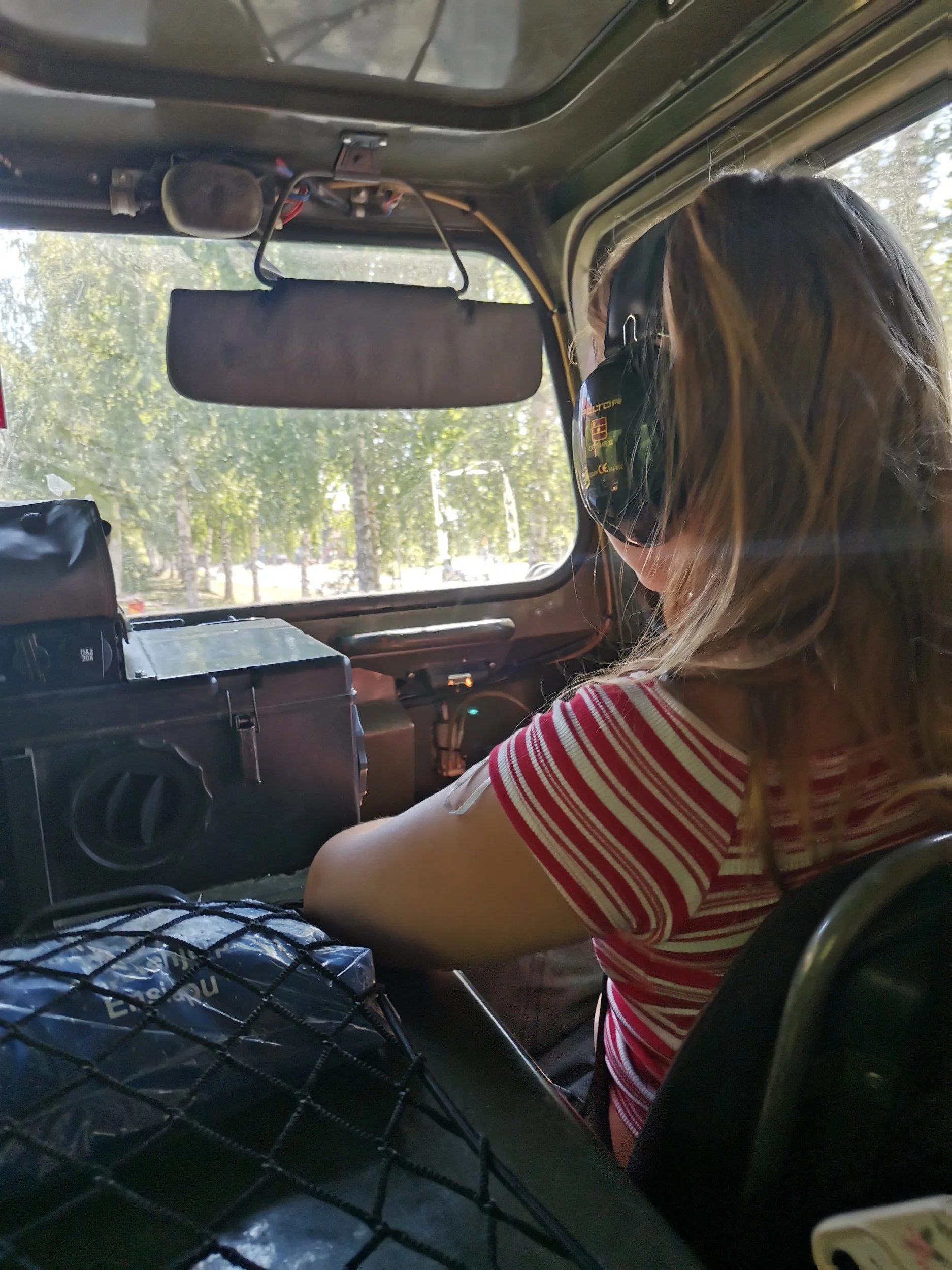Det var ingen kø å snakke om, og før vi visste ordet av det, så satt vi alle tre inni ei beltevogn med øreplugger og hørselvern på hodet. Det ristet og rykket, og noe aircondition var det absolutt ikke snakk om. I 30 graders sommersol virket de neste ti minuttene som én time - men 11-åringen syntes det var stas, for hun hadde blitt kommandert til å sitte foran “å være sjef” av en ung, svensk hjemmevernspojke. Så hun strålte fra øre til øre, og glemt var både Russland og nordisk geografi.