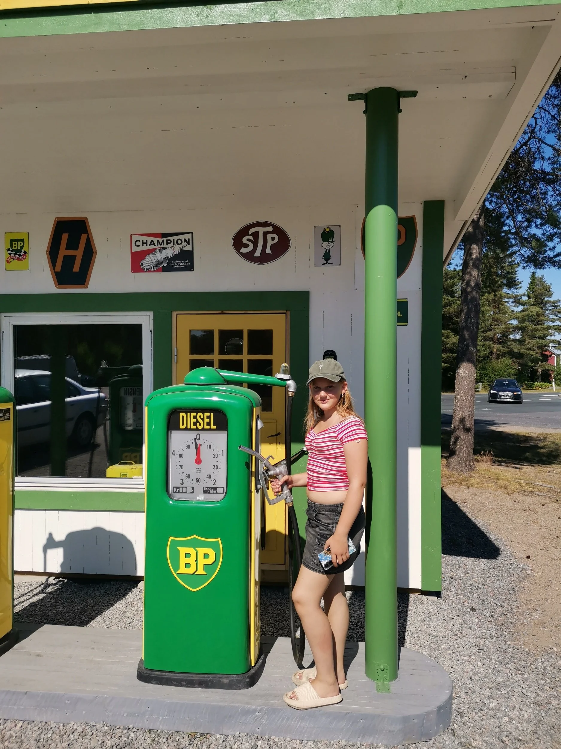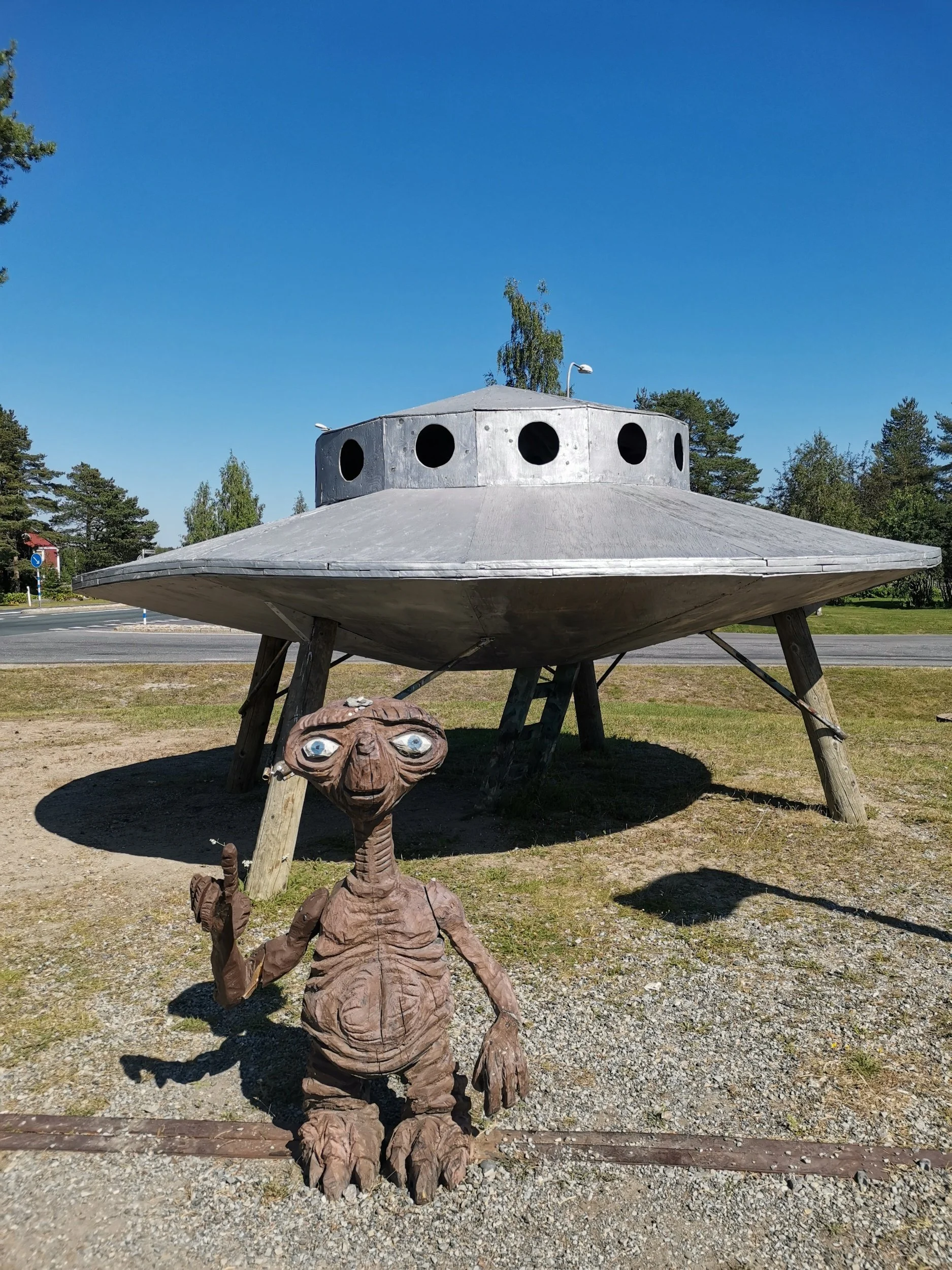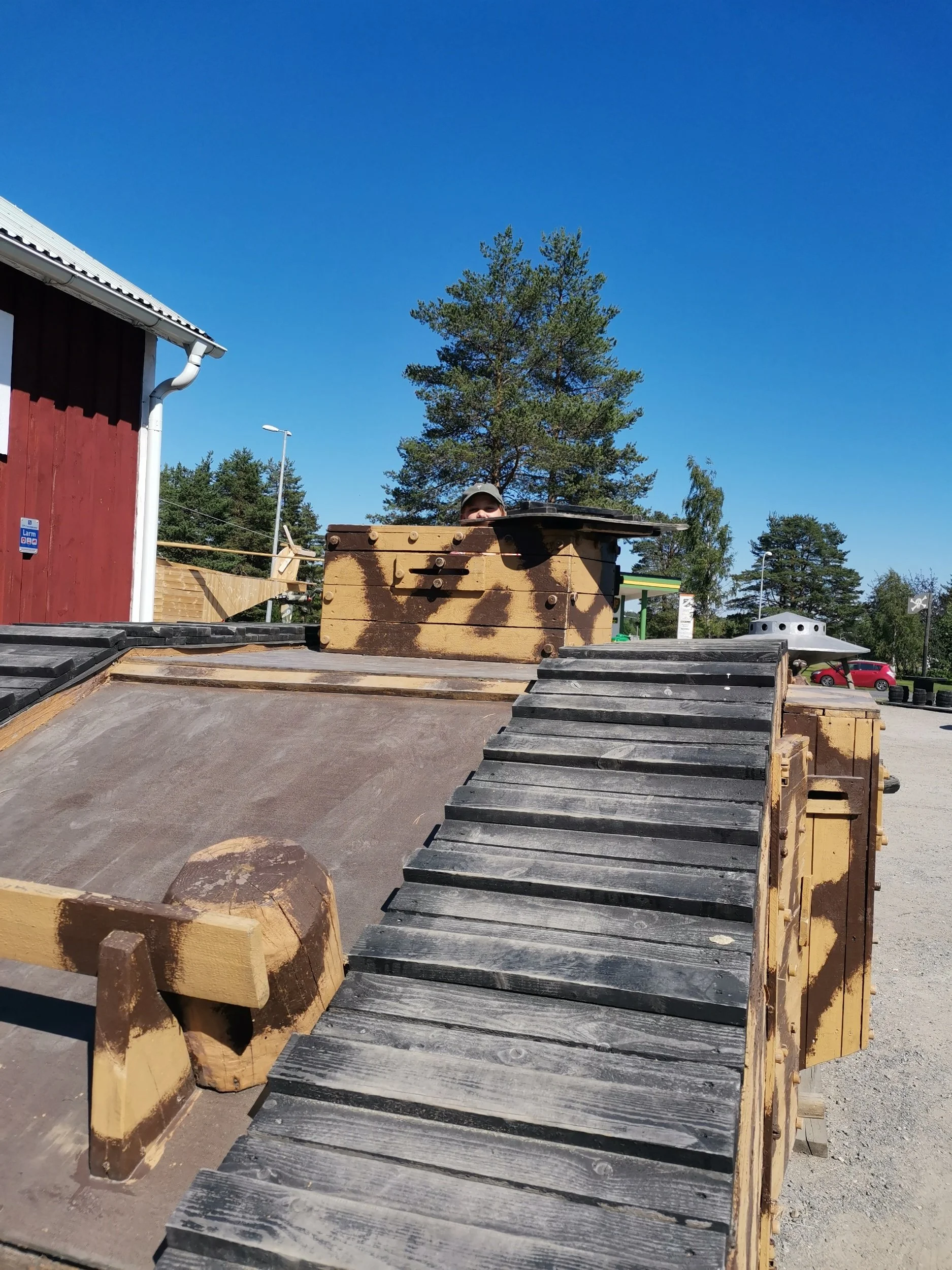 Vi var nå på et lite sted som het Sangis, og her hadde en lokal militærentusiast med hjelp av en kompis som var god med motorsaga, bygd opp en liten, gammel BP-mack for nostalgiens skyld, samt krydret utearealet med andre artige figurer og doninger i trevirke. ET og Jack Sparrow for å nevne noen, samt en langt mindre varm og bråkete beltevogn enn den 11-åringen var sjef for i Kalix.