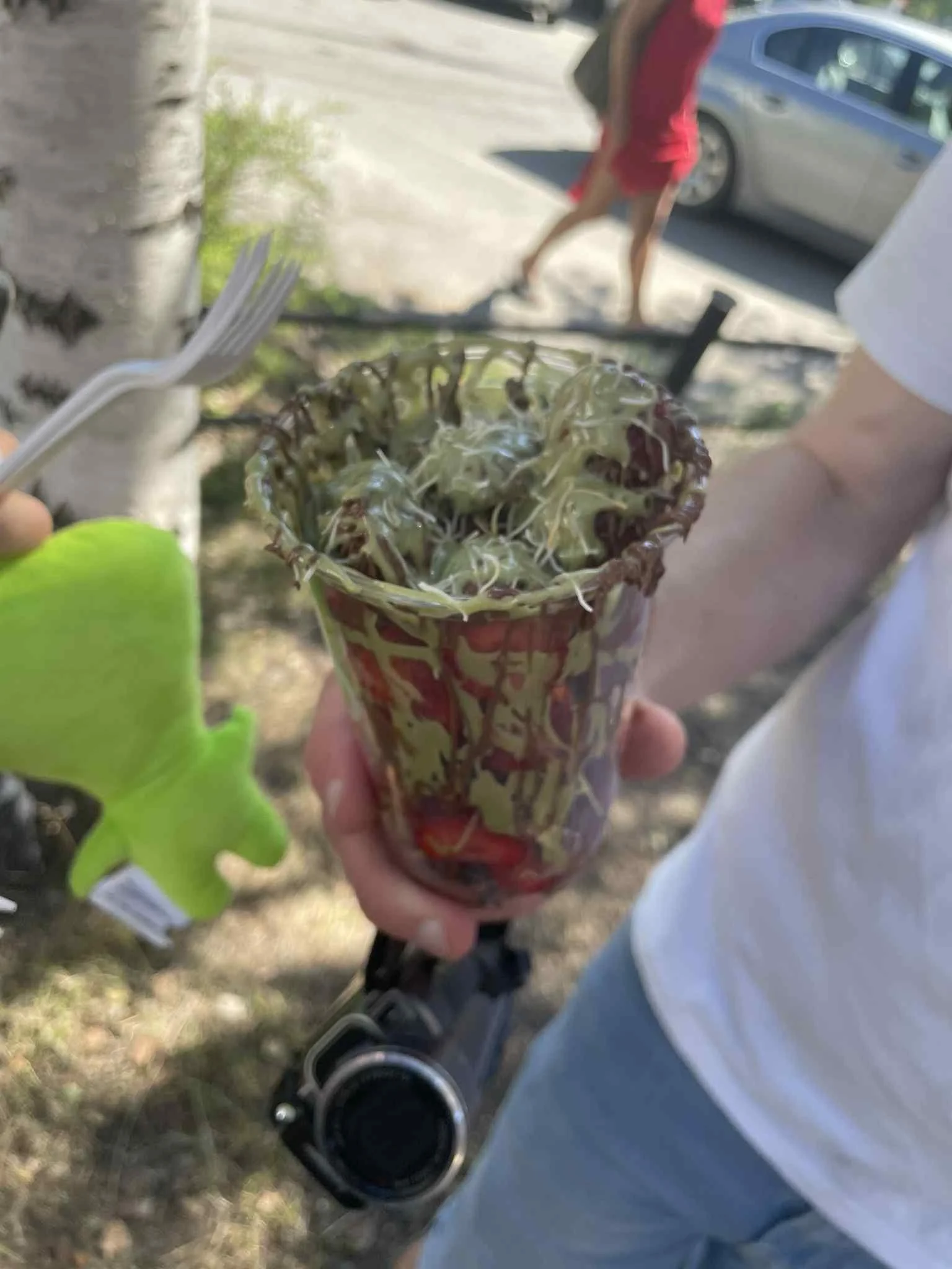 Da det endelig ble vår tur, så trakk vi oss tilbake med en plain variant uten mjukglass - men med et hav av tyntflytende, lunken sjokoladekrem og pistasjekrem. Sprinklet over så vel jordbær som plastikkrus, nesten som en slags spisbar Jackson Pollock.