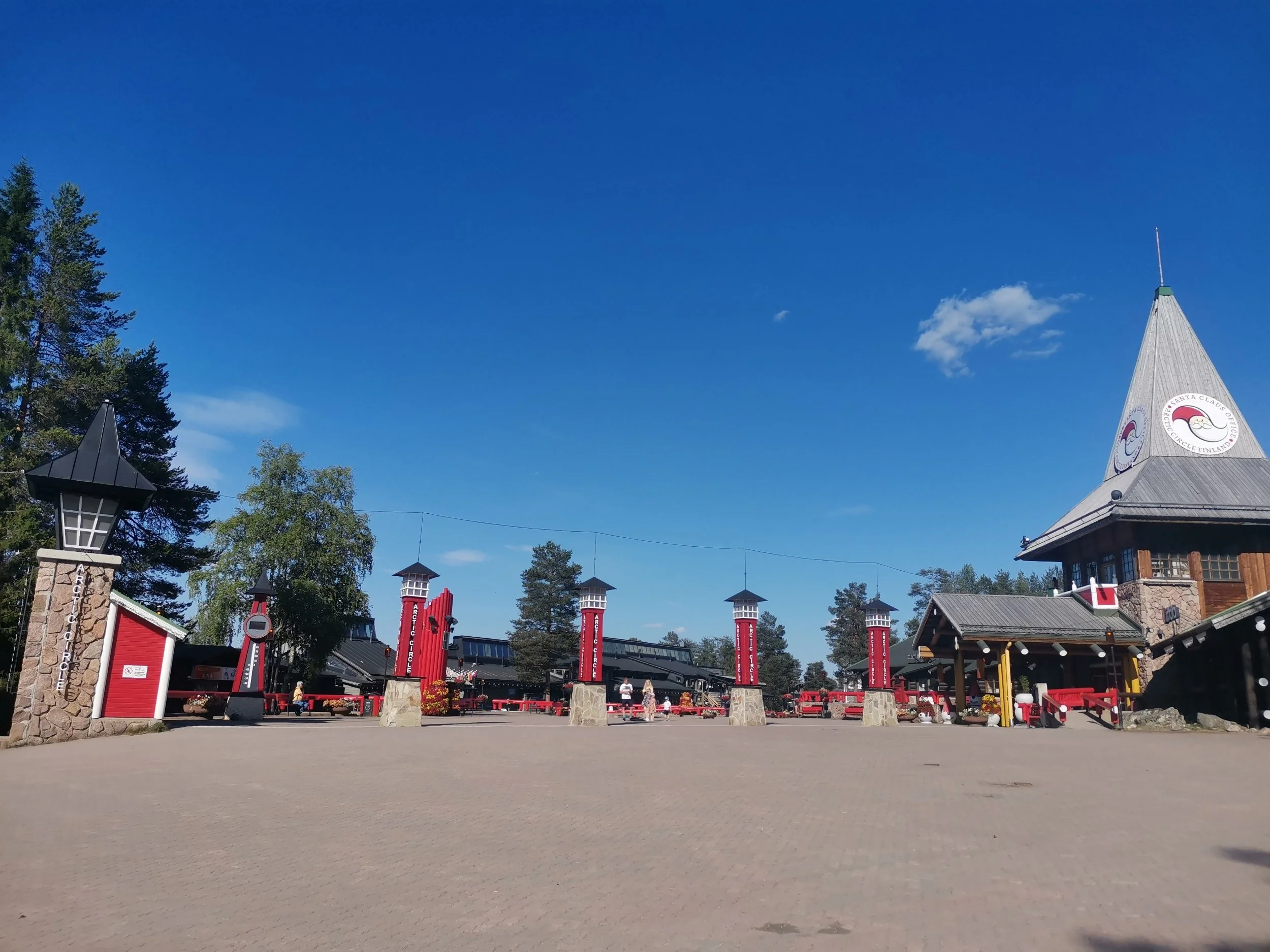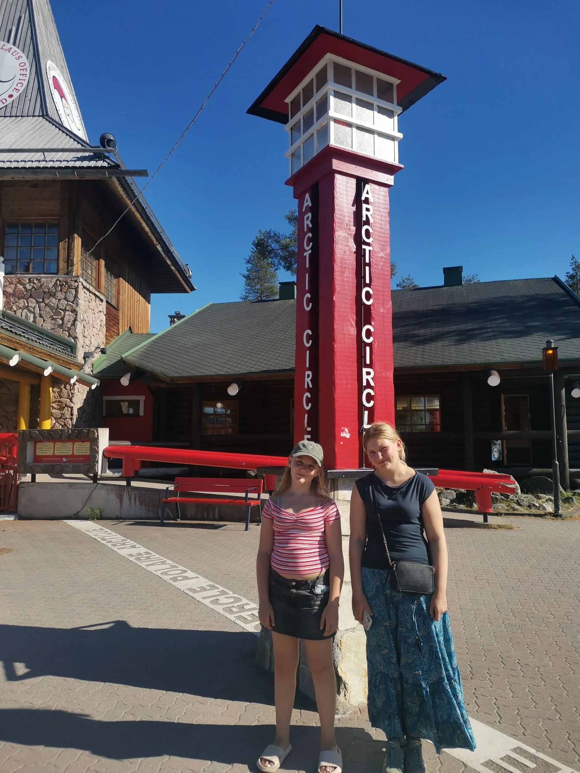 Gradestokken som stod ved siden av den symbolske polarsirkelen inne på området viste hele 33 grader, og klokka nærmet seg stengetid - 18.00. Vi hadde helt glemt at vi ved å krysse Torneälven også hadde reist en time frem i tid - men heldigvis husket telefonene våre på det for oss, så vi tidsakklimatiserte oss ganske så kjapt.