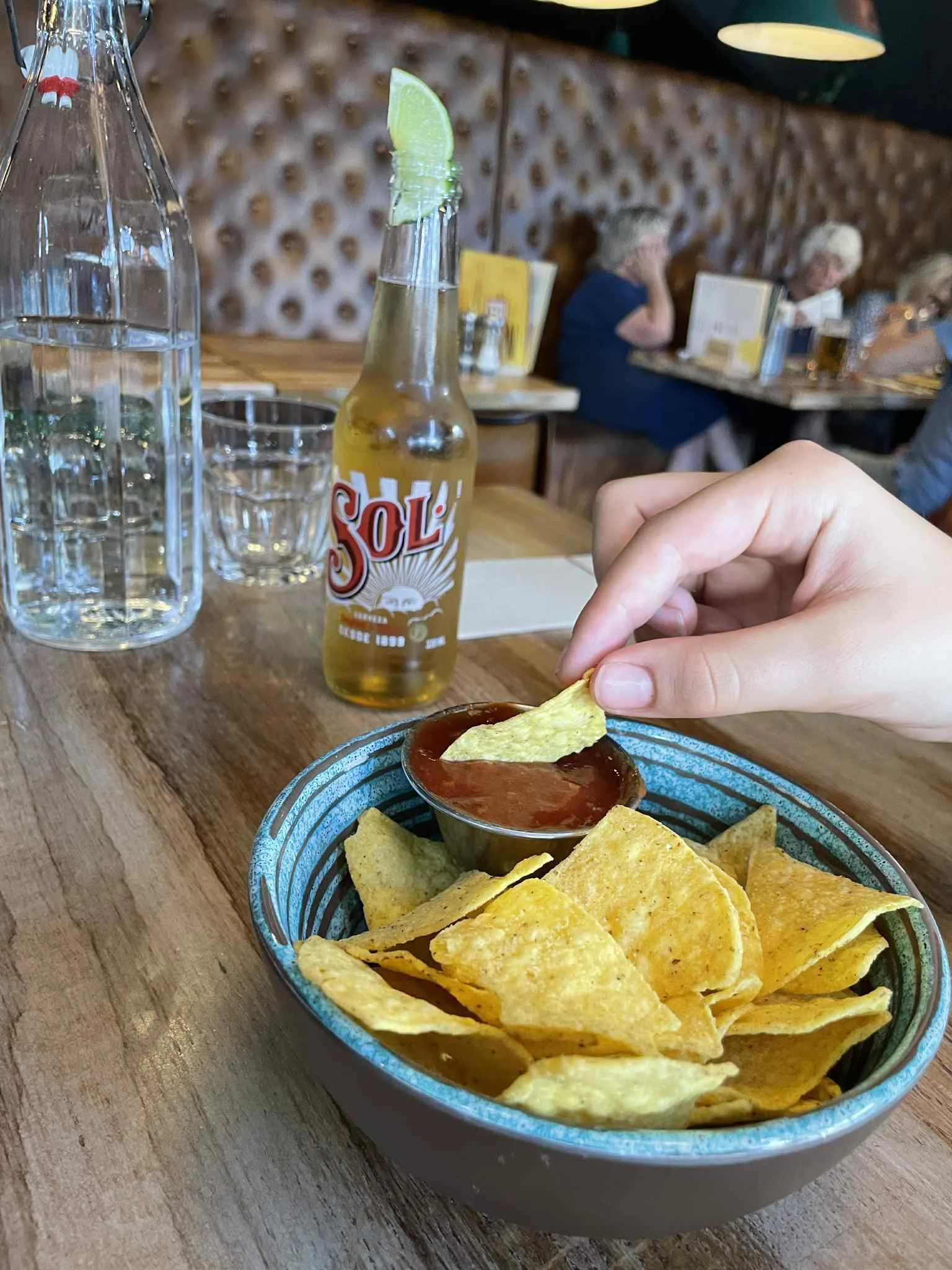 I tillegg kom det en porsjon plaine, salte nachos med dip på bordet “på huset”, i tillegg til en diger flaske kaldvatten, og tre glass. Kundene ble godt i varetatt i varmen av jentene som hadde sommerjobb her i sommer.