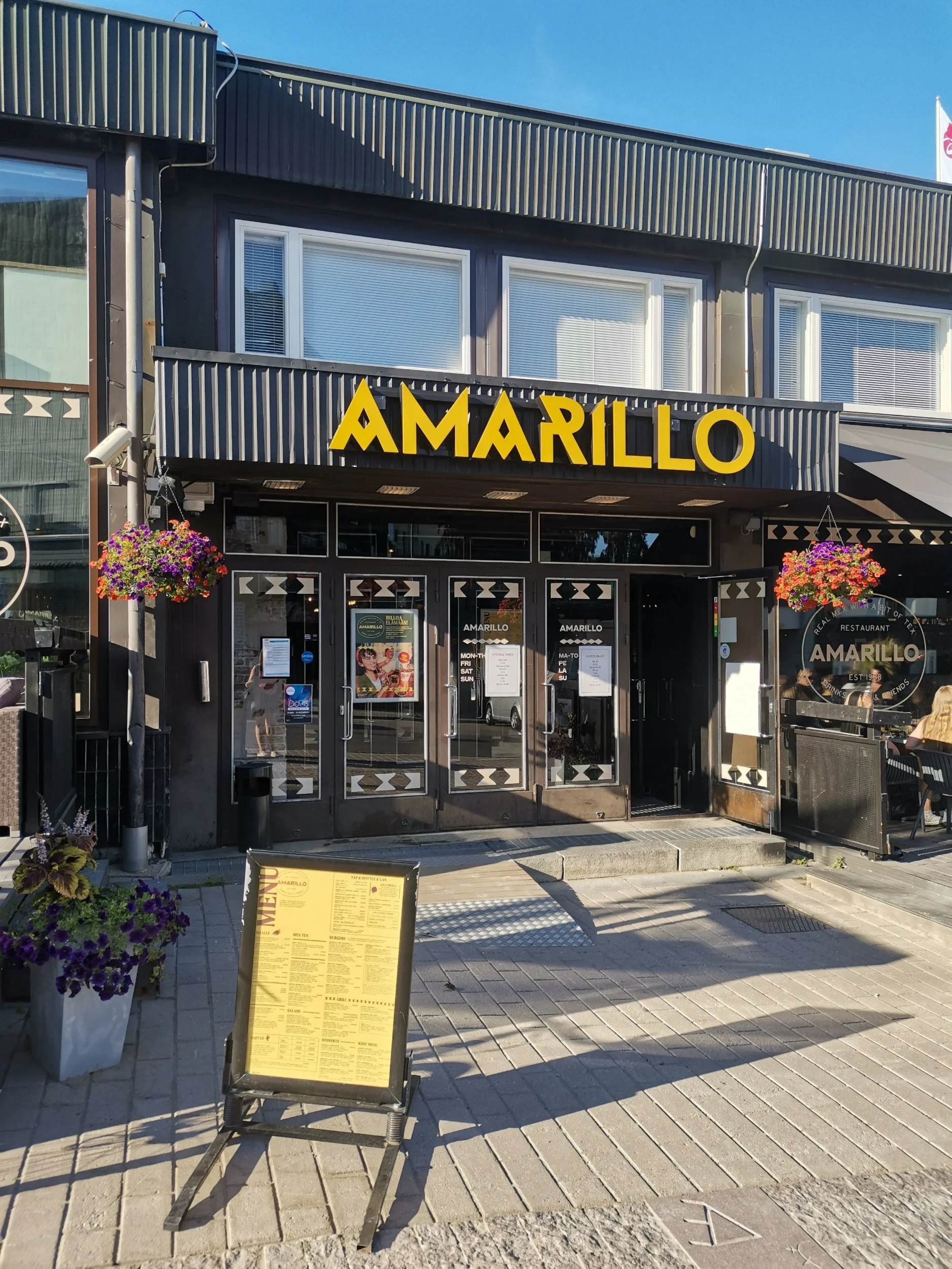 I samme øyeblikk fikk jeg øye på et sted som het “Amarillo”, og som fristet med Mex med litt innslag av Tex. For Taco-glade jenter, så var dette midt i blinken. De sa “ja!” spontant i kor, og vi valset inn, og gjorde oss til kjenne. Ei ung jente forbarmet seg over oss, og viste oss til et bord inne ved vinduet. For nå ville vi sitte inne, og det var heldigvis svalt og deilig, med god aircondition inne i restauranten.
