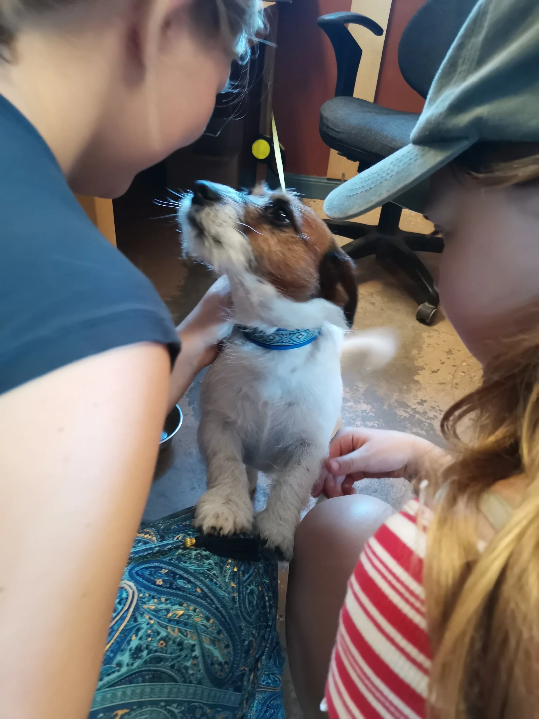 Vi måtte så klart også ta en tur inn i butikken og hilse på. Jeg skravlet noen ord med eieren, det meste så klart om været. Jentene på sin side tok seg av Bosse, som var med matfar på jobb, og ble strålende fornøyd med litt kos og kjærlighet i den kvelende varmen.