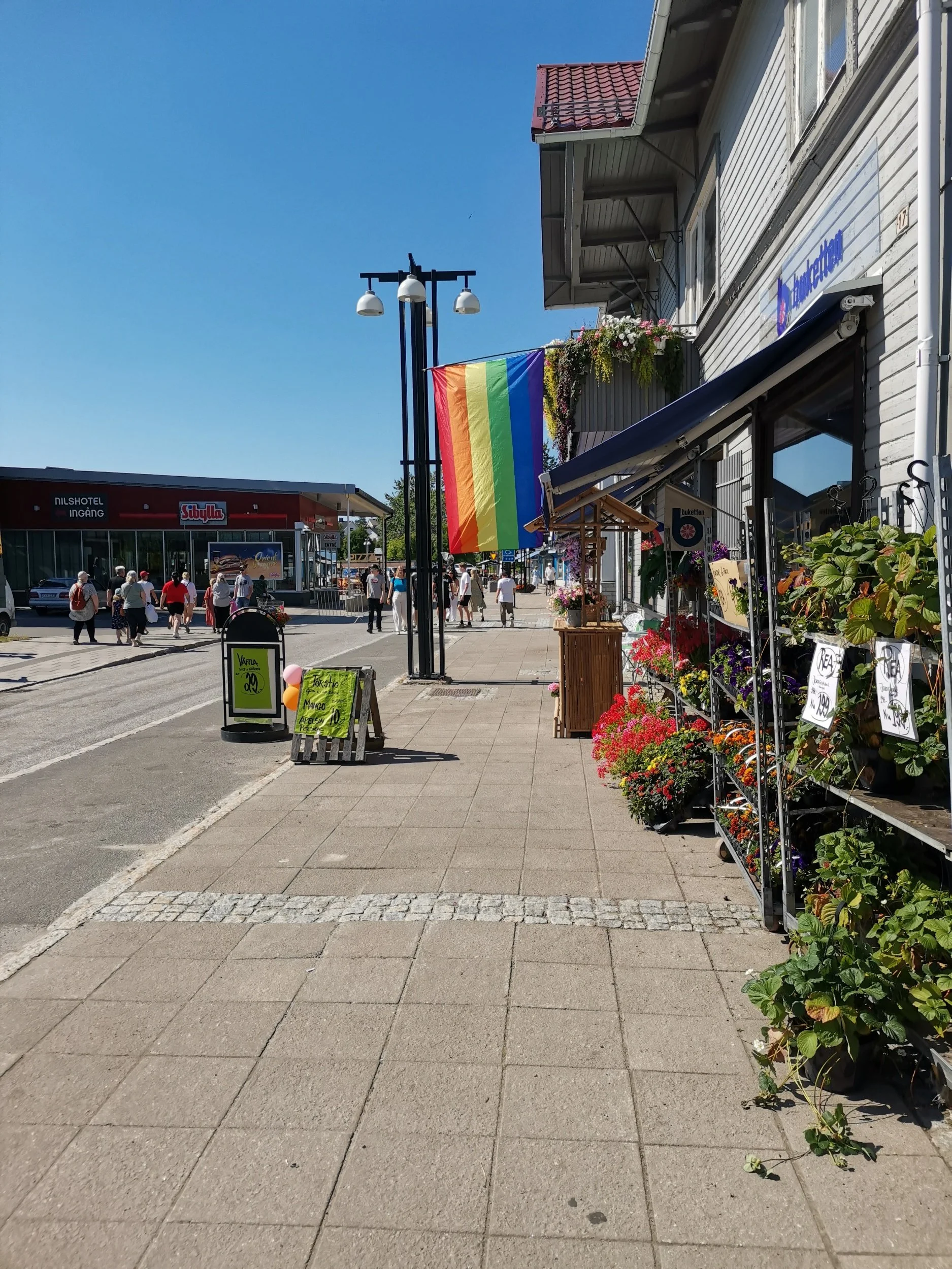Etter å ha fått opp alt det vi trengte for natta, så gjorde vi oss klare for å spasere ut igjen i varmen, og få oss noe mat. Nok en gang hadde vi helt glemt å spise noe ordentlig siden frokost. Litt snop hadde det nok blitt i bilen, og den plastikkoppen med jordbær og masse usunt i Kalix. Nå trengte vi noe som kunne ligne på middag i skrotten, og ruslet ut i den fortsatt brennhete sommerkvelden, og labbet nedover i retning det som lignet på hovedsentrum av byen.