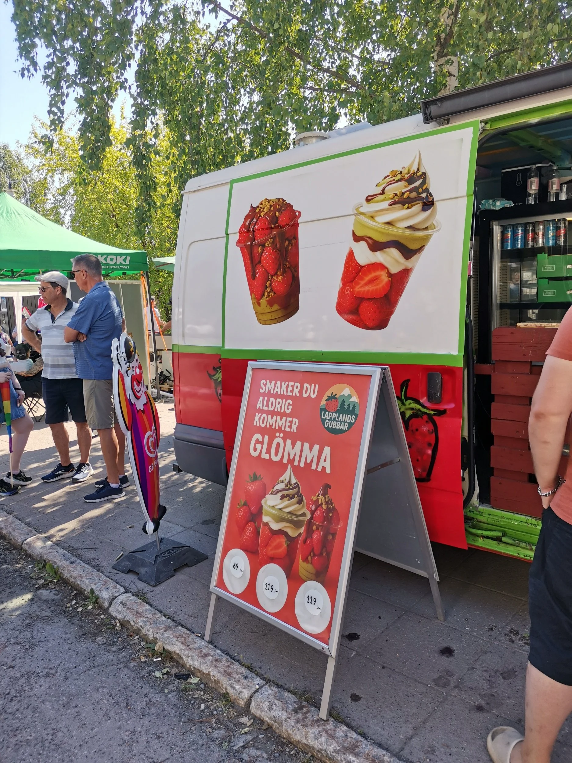 11-åringens øyne borret seg inn i et skilt som stod utenfor en street-food vogn rett nedenfor. “Smaker du aldrig kommer glömma”. På turer som dette, så må man gi og ta litt som økonomisk ansvarlig for det hele. Hvis det ikke ble ei remse tivolibilletter til 250 kroner, så fikk det vel i stedet bli en kopp jordbær til 119.