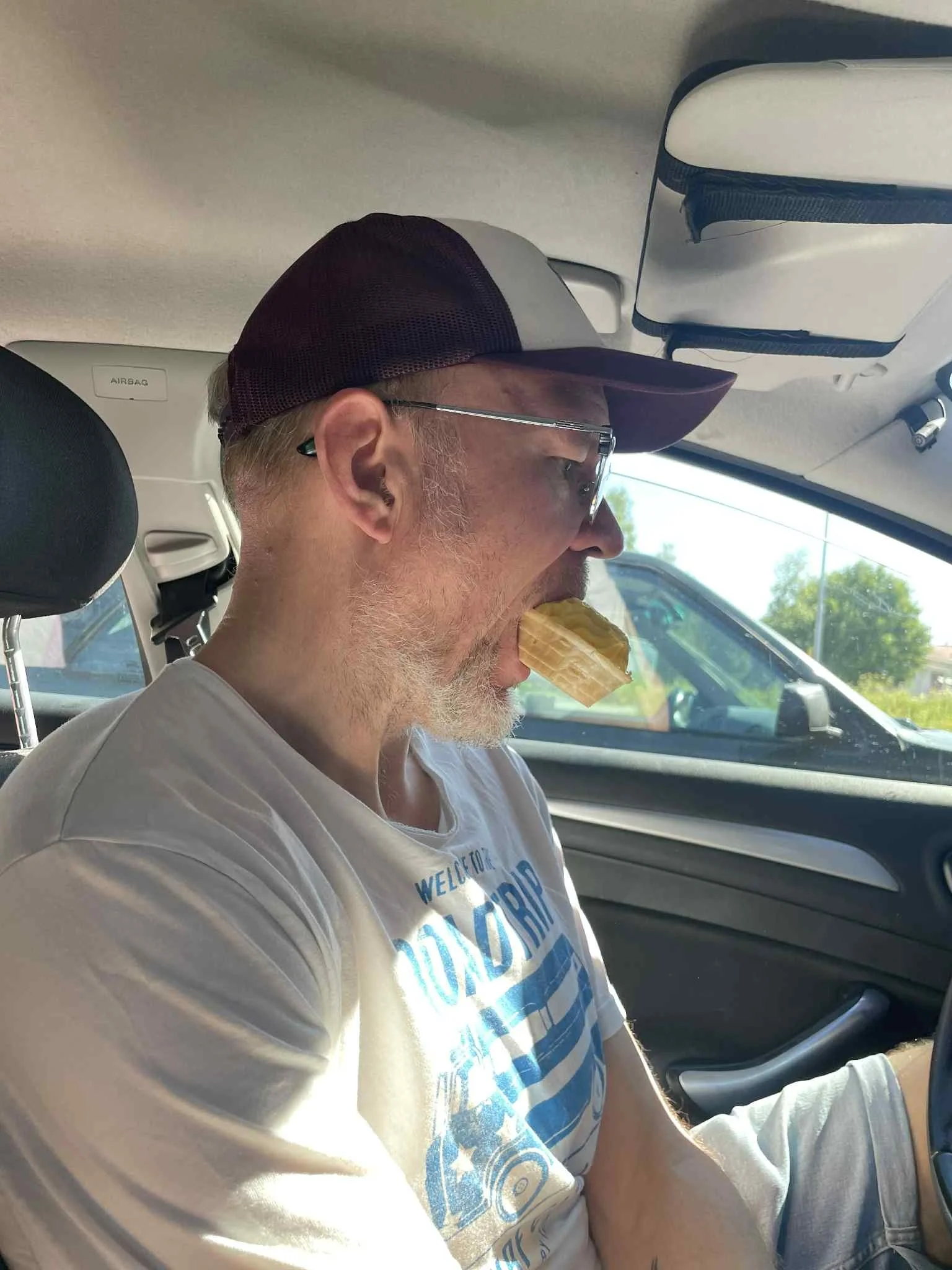 Det tok sin tid før det ble vår tur, for innen vi fikk bestemt oss for variant - så hadde folk køet opp foran den stakkars unggutten som febrilsk drev alene i varmen inne i den tette isvogna. Tankene mine gikk til Steve Buscemi i Trees Lounge. Ingen sammenligning forøvrig.