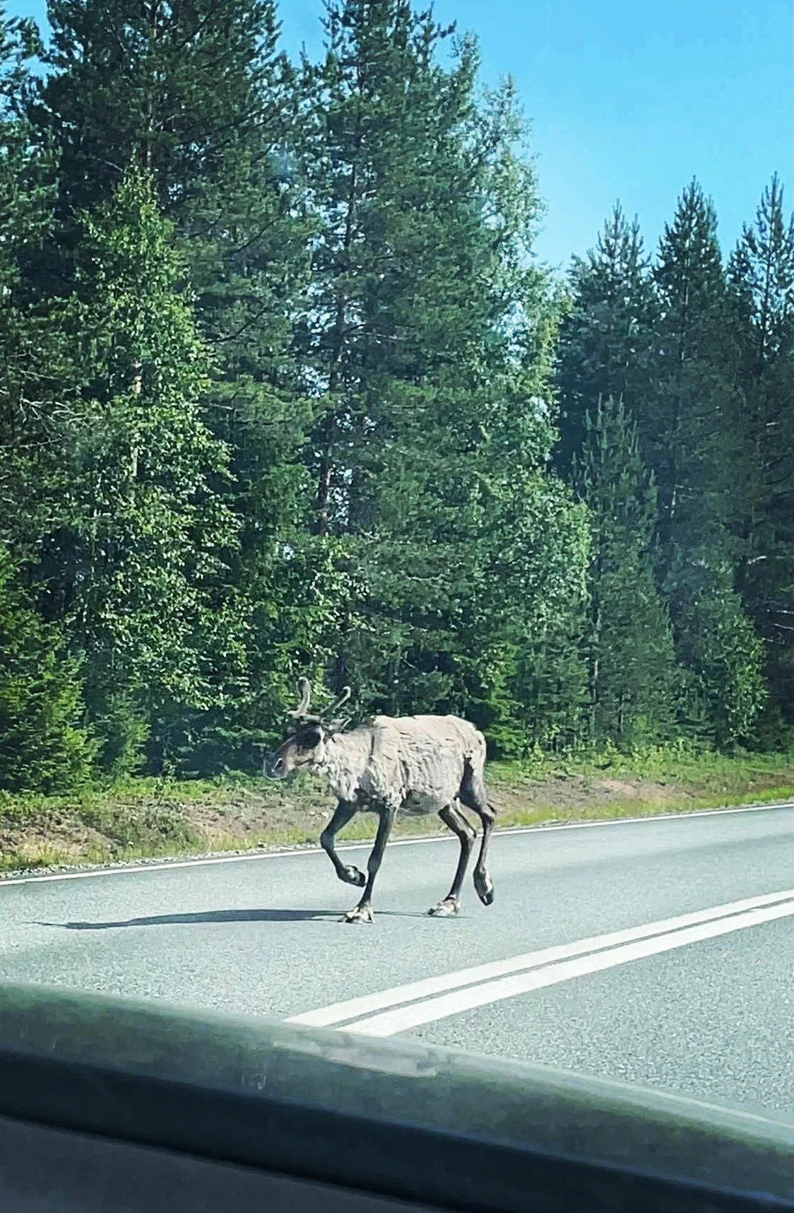 Like etterpå fikk vi øye på noe som så ut som en syklist i det fjerne, som lå litt farlig nær midtstripa på veien. Da vi kom nærmere, fikk vi se at det jammen meg var en enslig, liten rein. Muligens en kalv. Iris smilte fra øret til øret, og filmet det hele da vi passerte den i krabbehastighet. Jammen meg hadde vi ikke litt flaks, allikevel.