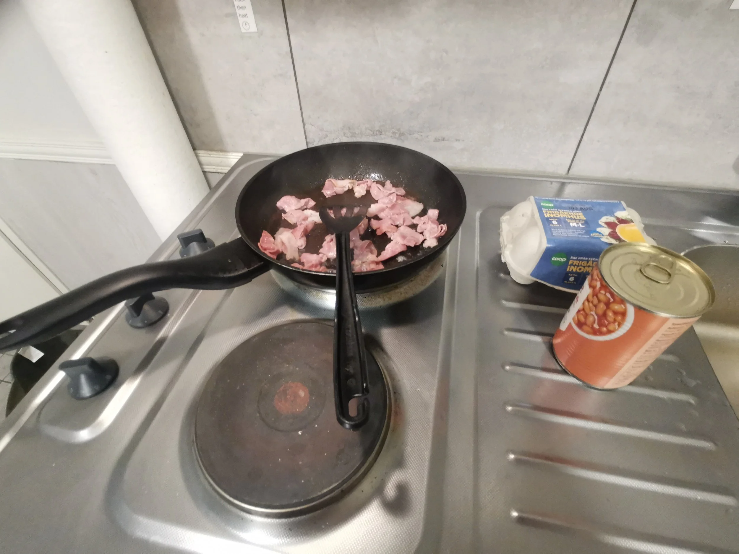 Deretter puslet jeg med litt forefallende, og svingte igang en luksus-frokost med medbrakt flesk og egg fra Sverige, og tomatbønner fra Norge. Nærmere enn Full English har vi ikke vært på lenge.