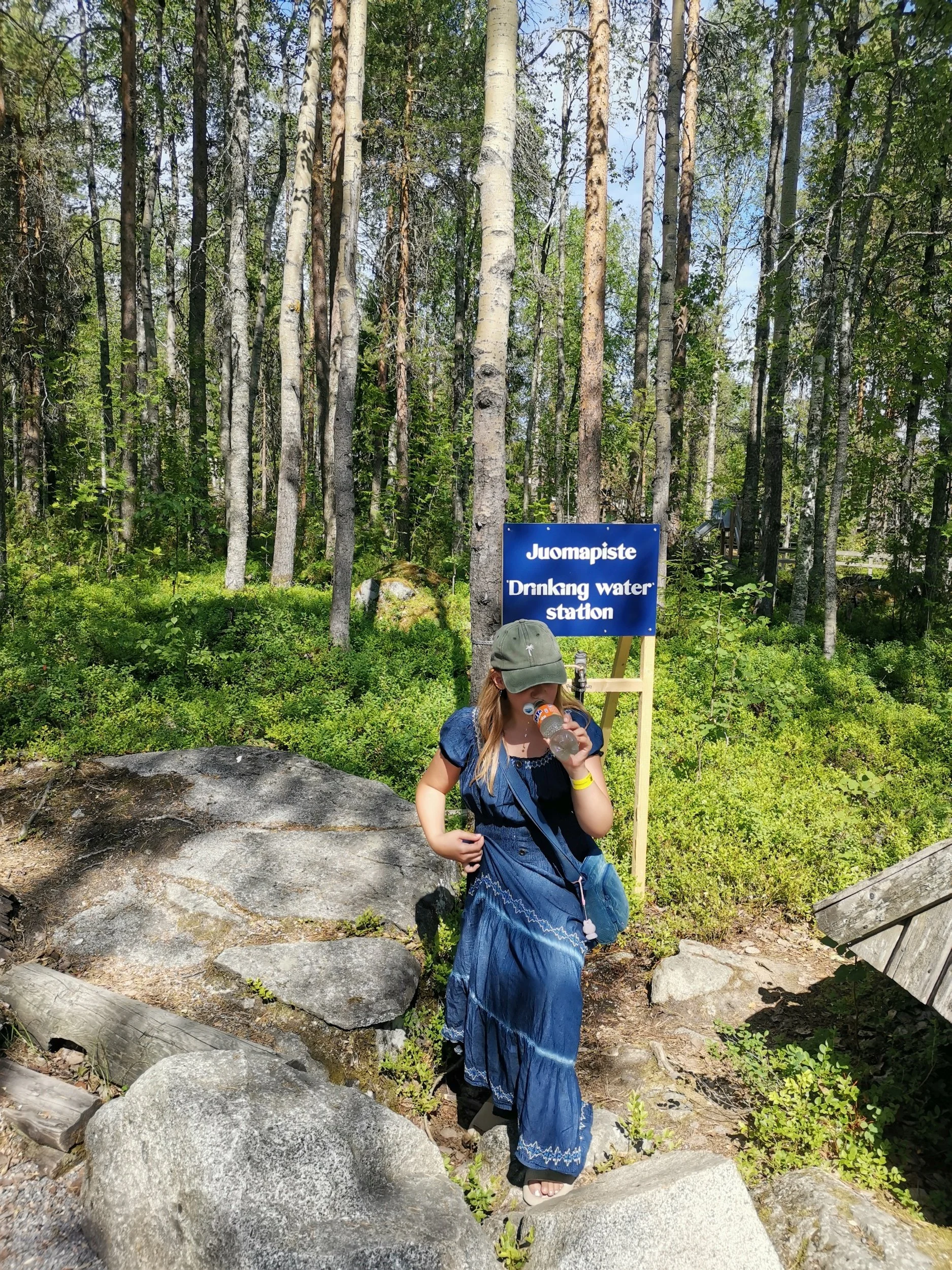 Sola var nå så sterk at vi trengte flere suppleringer av solkrem på stien. I tillegg burde vi i retrospekt også ha tatt med oss myggspray - for nå fikk vi endelig også kjenne på at vi var i myggens rike. Jeg skjønte tegninga da jeg så en finsk to-barnsfamilie foran oss på stien spraye ned både voksne og barn før de fortsatte videre. Men det fikk gå. Noen myggstikk og litt kløe nå ville egentlig vært det minste problemet. Jeg var mer skeptisk til om vi hadde med oss nok kaldt drikke. Jeg hadde stappet et par flasker Novelle med bringebærsmak i stringbagen jeg tok med meg inn. De var isende kalde da vi forlot Rovaniemi, men hadde allerede rukket å bli pisslunkne. I tillegg nærmet flaskene seg tomme.