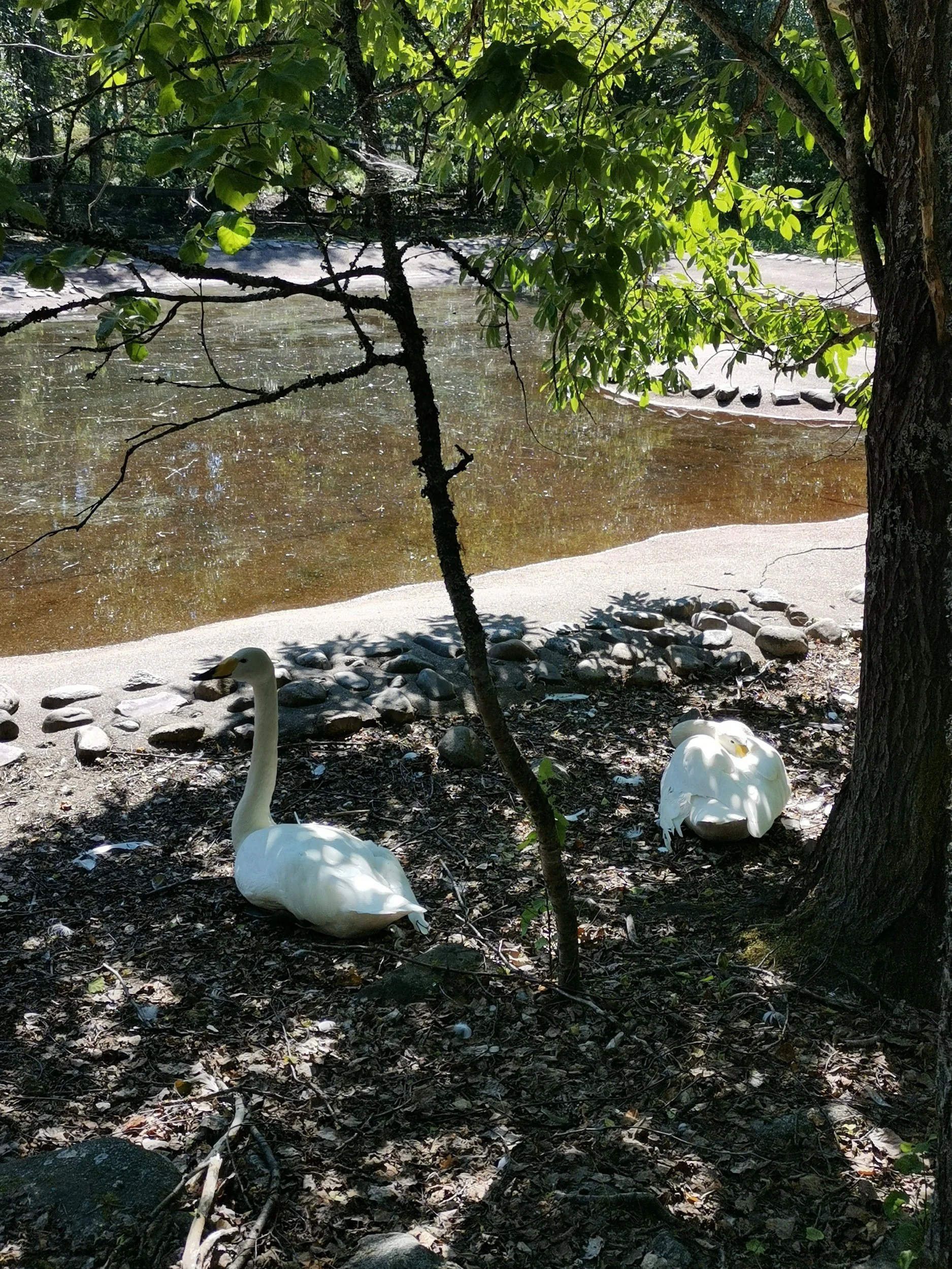 Selv sangsvanene syntes det var for varmt til å være på vannet i dag, så de hadde også funnet seg en plass i skyggen, der de tok parklivet med en tilsynelatende ro.