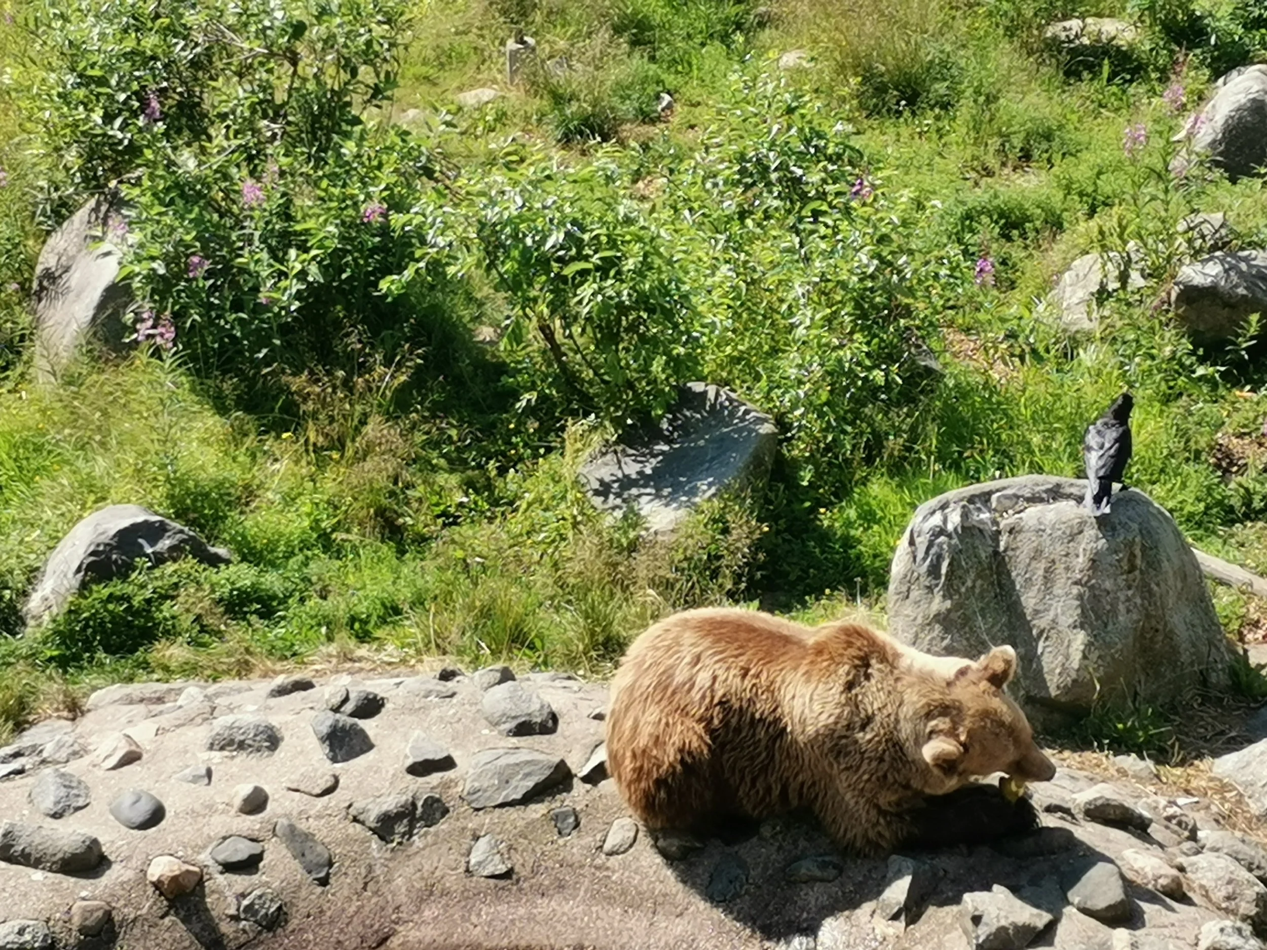 Hvordan stod det så til med brunbjørnen? Da vi kom til dens rike, så var det ingen andre å se i den store innhegningen enn en svart ravn som satt på en stein. Kanskje ventet den på maten til brunbjørnen, eller muligens ventet han bare på kameraten sin.