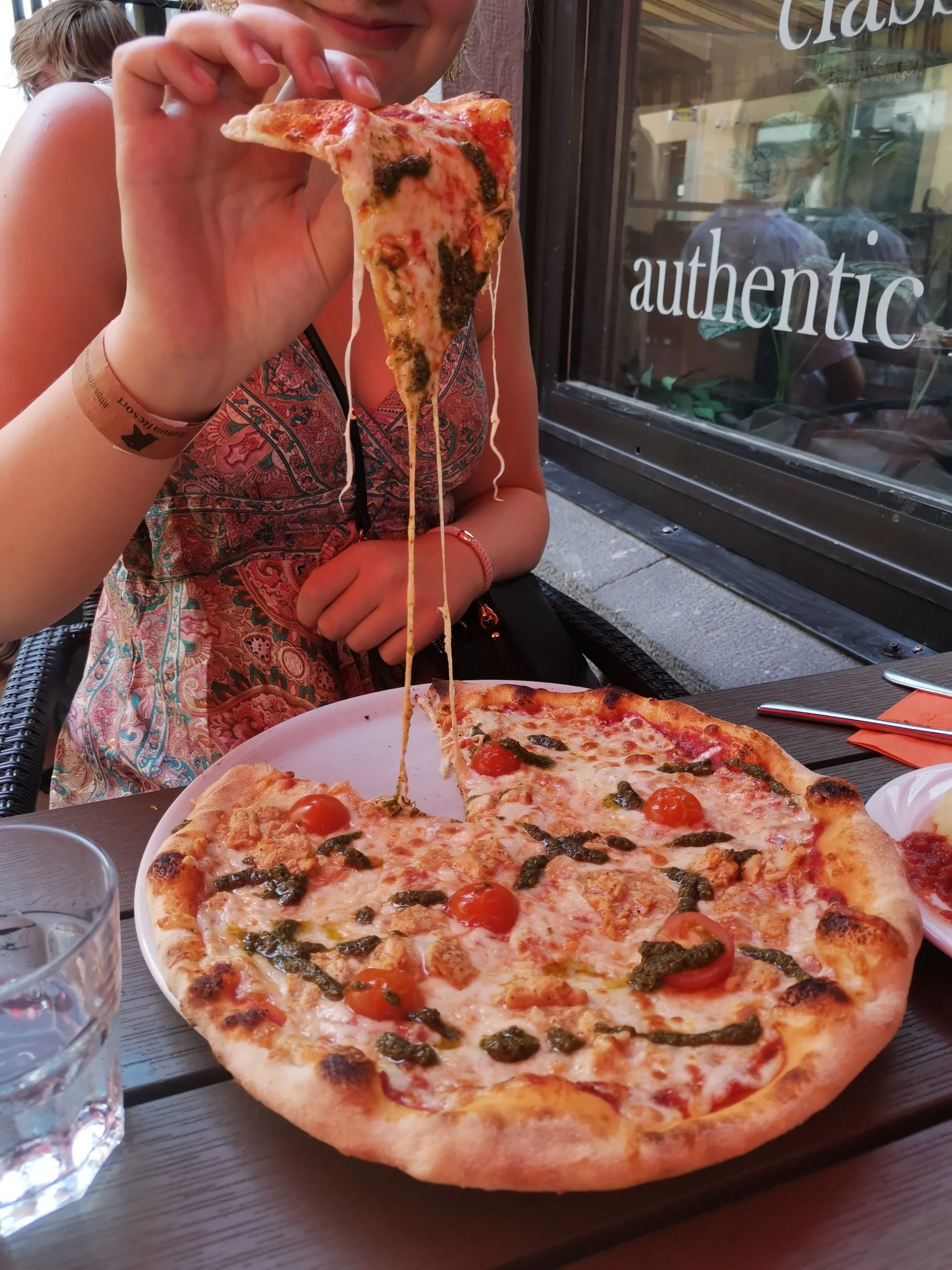 Det ledet oss til noe som lignet på ei hovedgata, og i ei sidegate av denne oppdaget en av jentene at det stod ‘pizzeria’ på et skilt. Vi var ikke vonde å be, og like etter hadde vi fått oss et utebord i skyggen på Pizza Il Forno.