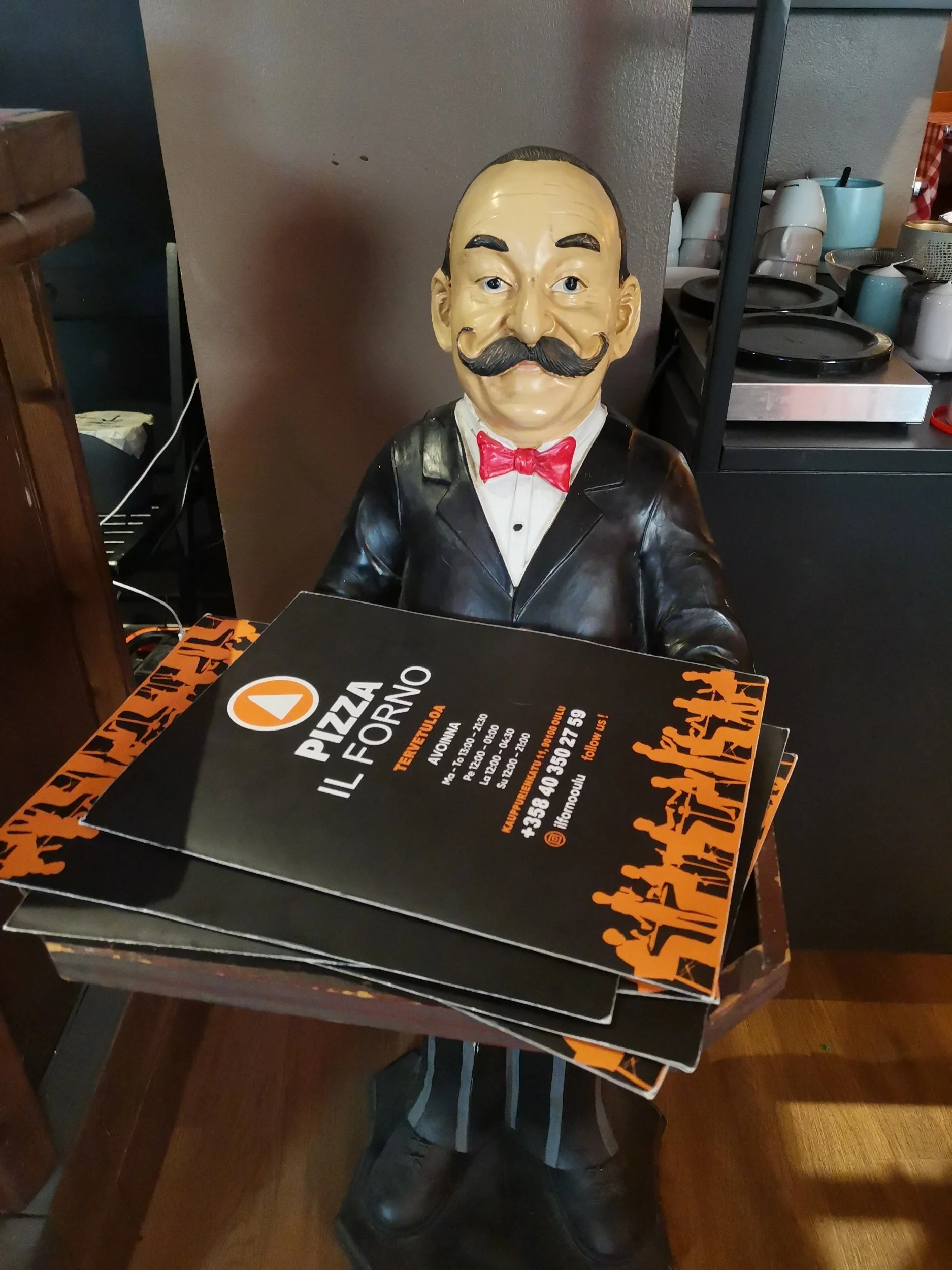 I nabobygget holdt en pizzarestaurant til. Av den typen du finner i alle småbyer, som også har kebab og salad [leses på svensk] på menyen. Her var det allerede ganske folksomt, men det var et par båser igjen. Før vi satte oss måtte vi prøve å oversette menyen ved disken ved hjelp av Google Lens.