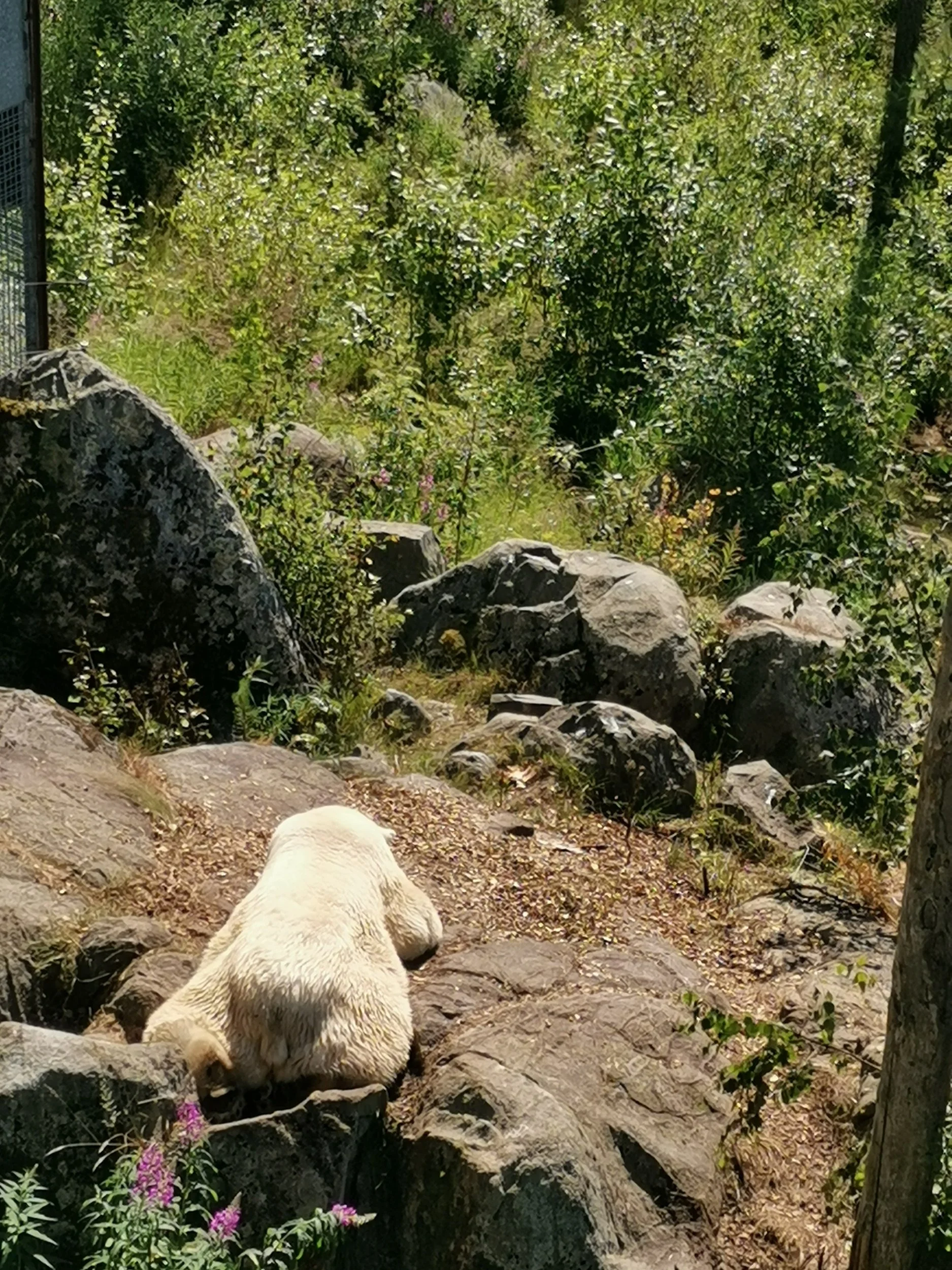 Men vi hadde vel ingenting å klage på. Det var verre for den stakkars isbjørnen, som vi ble overrasket over å se utendørs lengst opp i den store parken. Stakkaren lå helt utslått oppå noen steiner, som neppe kunne være annet enn glovarme i denne heten. Vi fikk lyst til å helle resten av det kalde drikket vårt ned til den, og dusje den med iskaldt vann fra en brannslange - men vi fikk nå bare stole på at de som jobbet her hadde noen triks for å øke trivselsfaktoren til dette utslåtte eksemplaret av verdens største landlevende pattedyr.