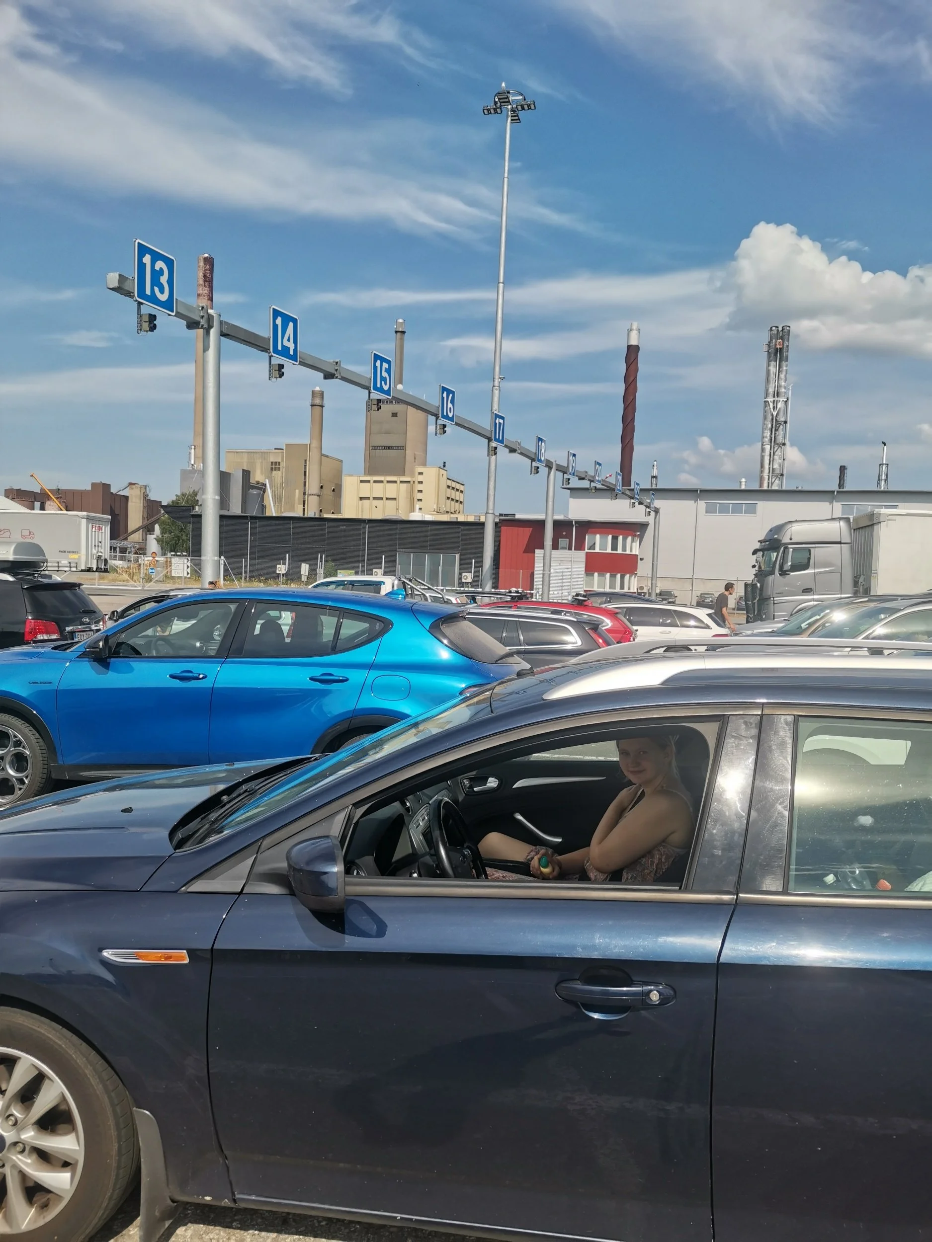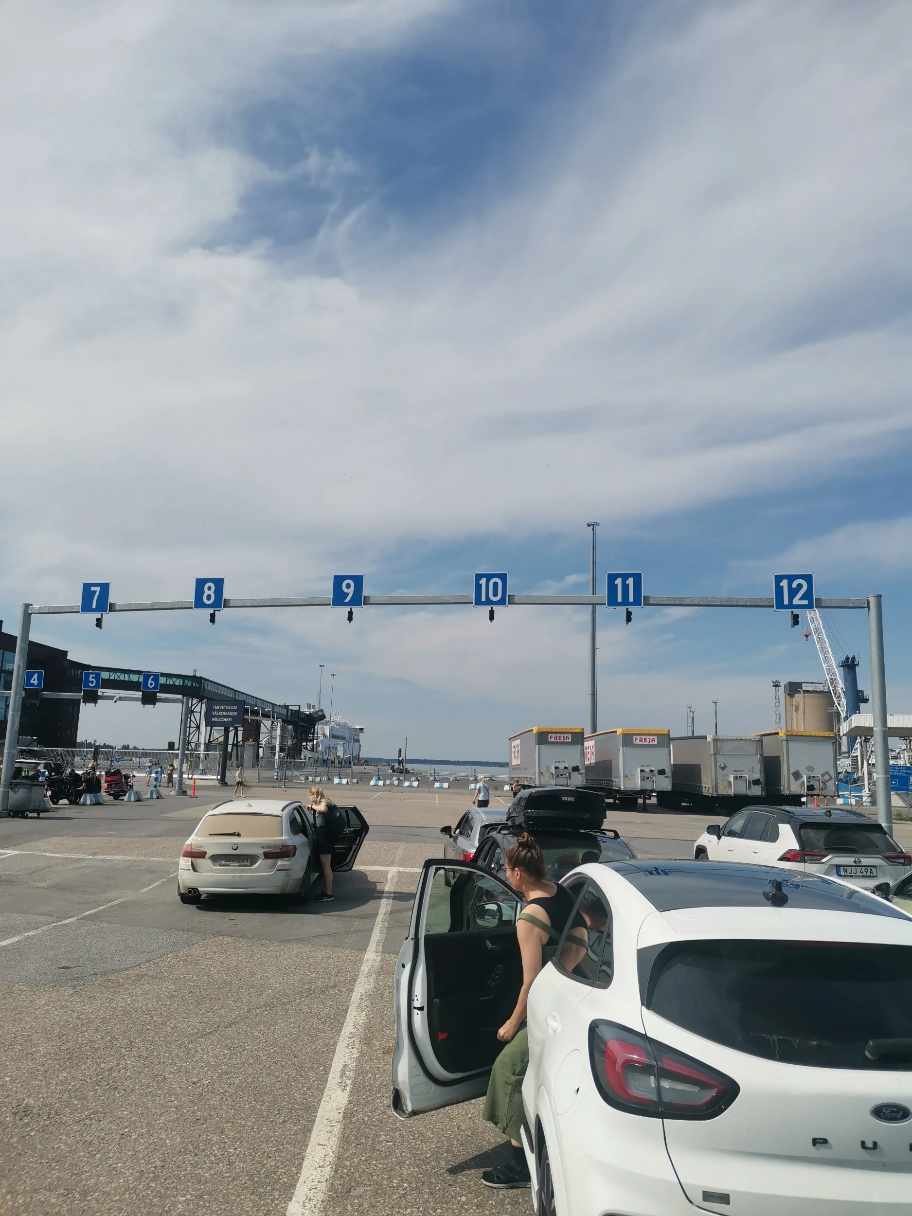 Nå hadde vi bare tida og veien før vi skulle være på kaia. Siste frist for innsjekk var én time før avgang. Det er nok en sannhet med visse modifikasjoner, for da vi ankom ti minutter før tida, så var det fortsatt ganske glissent på plassen. Nå var vi da der, og vi kunne åpne dørene og strekke litt på beina før det var tid for å kjøre ombord. Temperaturen viste fortsatt 30 røde, selv om det var langt flere skyer på himmelen enn i går.
