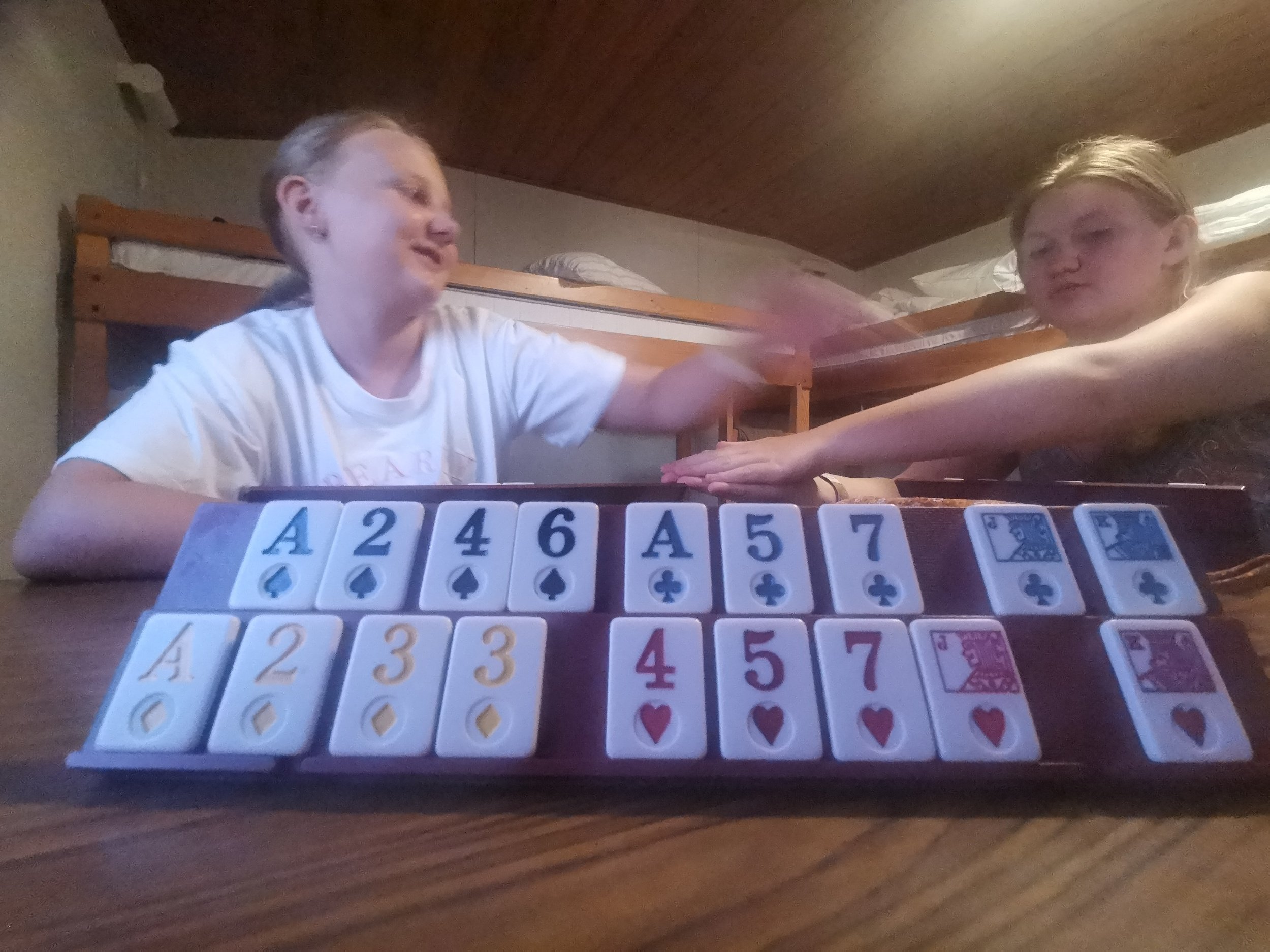Resten av den vakre kvelden og natta ble tilbrakt på hytta sammen med enda flere mygg. En horde smatt inn da vi prøvde å lufte litt med lyset på i hytta. Ikke akkurat et sjakktrekk. Det tok imidlertid ikke gleden fra Evelin, siden hun slo oss to ganger på rappen i Rummy - før jentene trakk seg tilbake til køyesengene sine, og fattern fikk blogget seg ferdig for i dag - langt, langt på overtid som alltid.