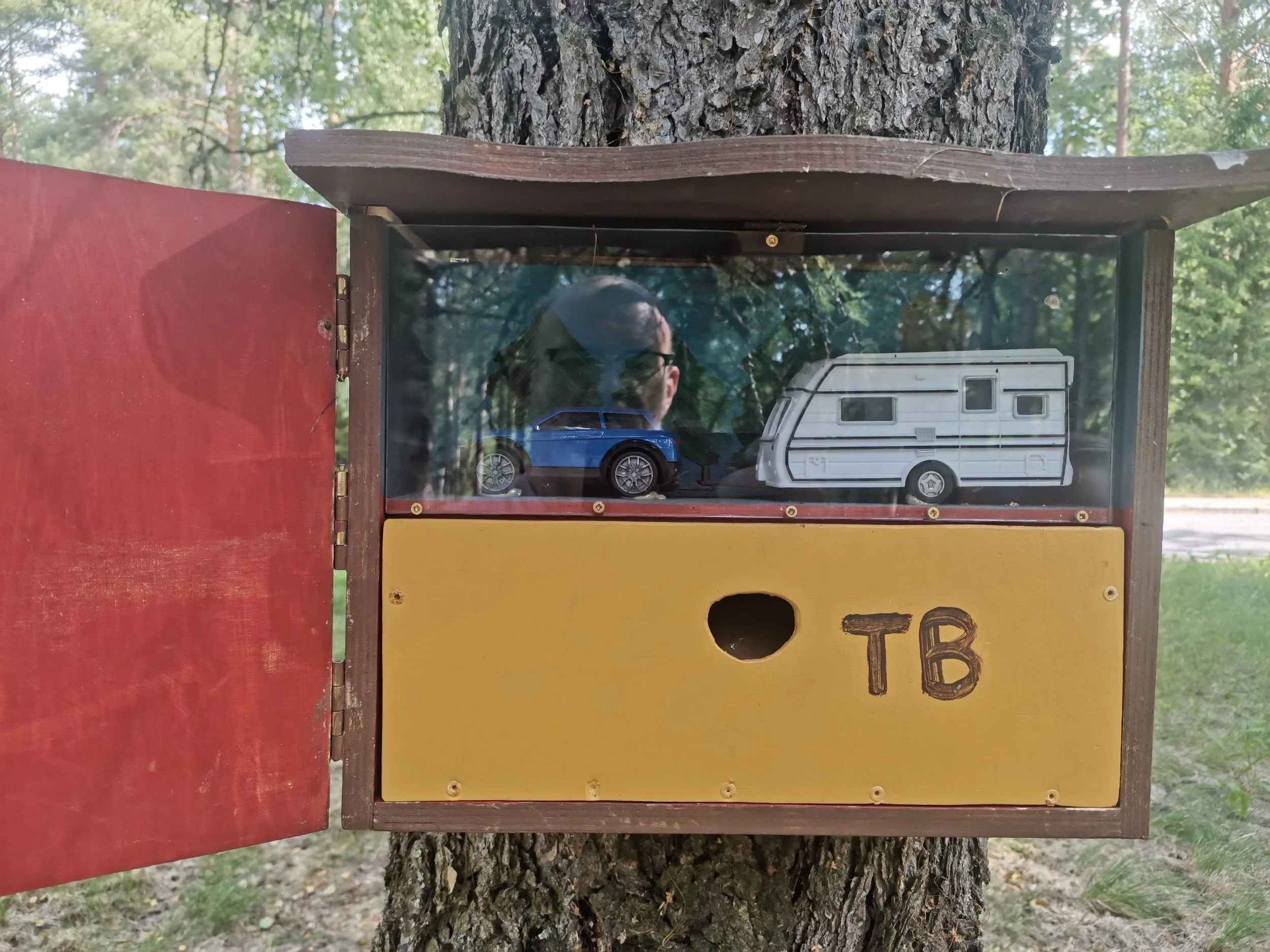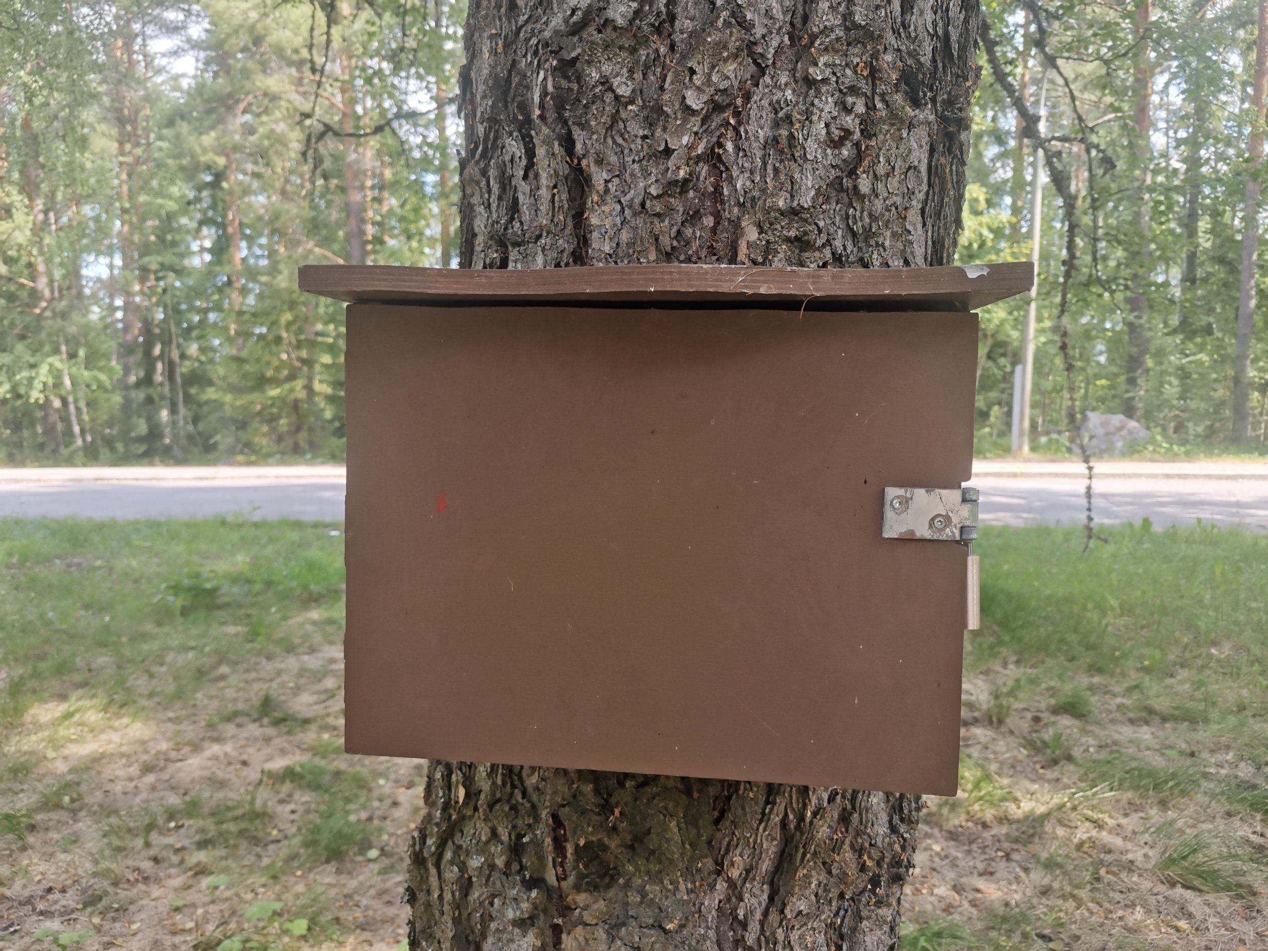 Rett utenfor campingen hadde jeg kvelden før spottet en geocache på appen, som jeg tenkte vi måtte prøve å finne før avreise. Vi hadde til gode å finne en i Finland, og generelt vært litt for dårlig til å prioritere denne artige aktiviteten på turen. Evelin spottet det som lignet ei fuglekasse med en gang vi stoppet ved koordinatene, og løp bort for å sjekke ut.