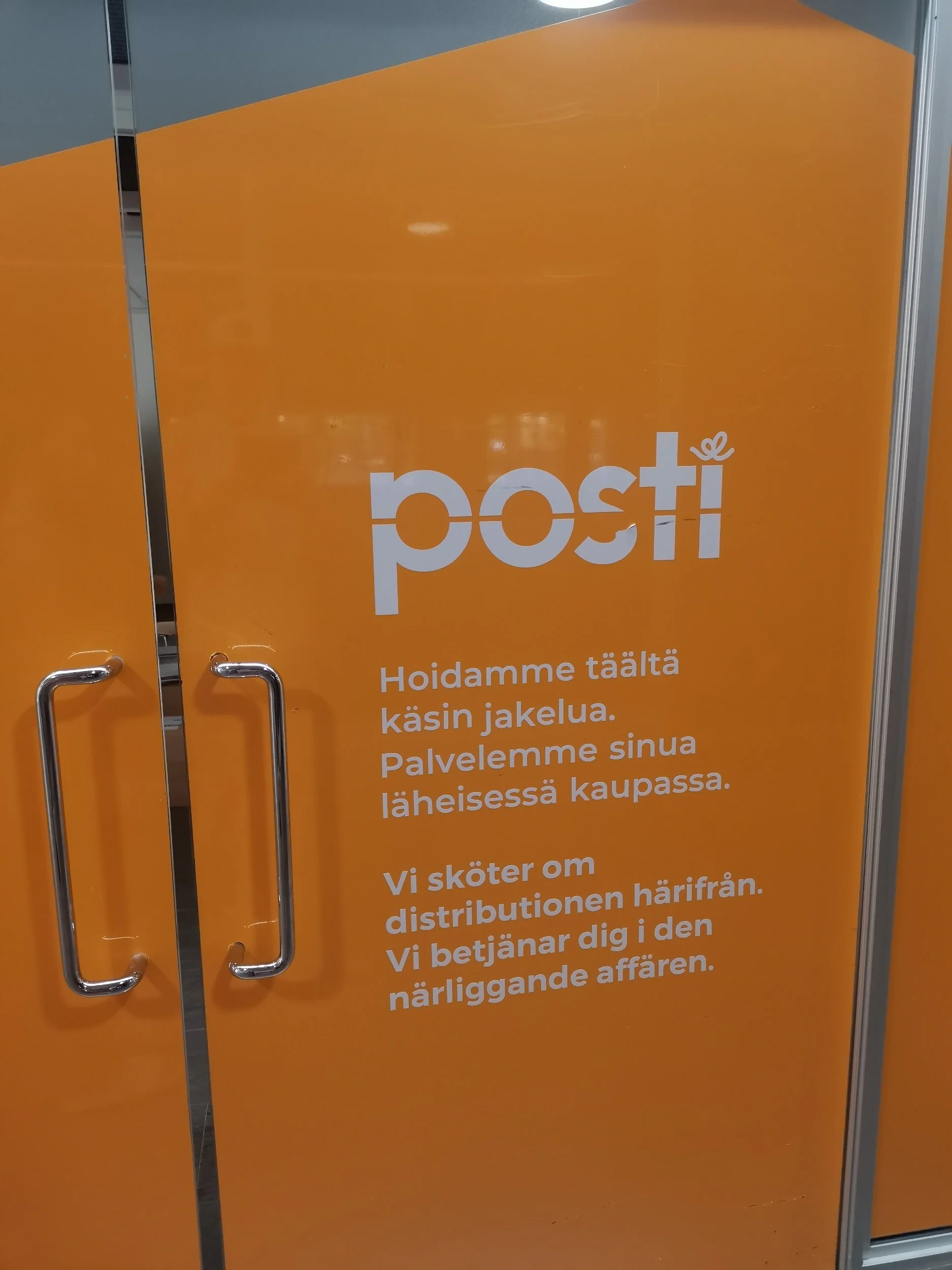 Da vi kom til postkontoret, ble vi møtt av en stengt dør, og vi kunne skimte pappesker som var lagret på innsiden. Effektiviseringen hadde tydeligvis kommet til Finland også, for tilfeldigvis oppdaget vi at en matbutikk på det samme senteret hadde tatt over butikken - post i butikk!