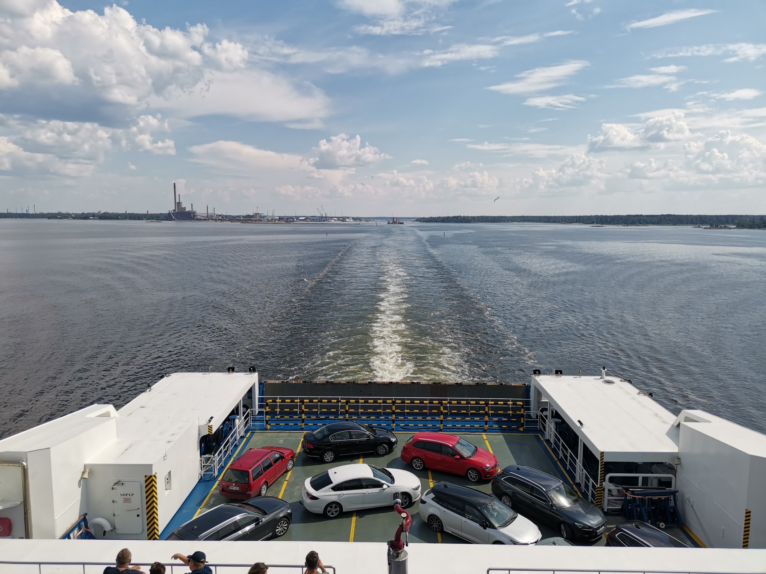 Overfarten skulle ta tre og en halv time, så det var greit å ha et sted å sitte - men det gikk ikke lenge før vi ble litt rastløse. Vi spaserte en tur opp på soldekket på plan 9, og skuet tilbake på Vaasa by mens vi forlot havna. Farvel, Finland!