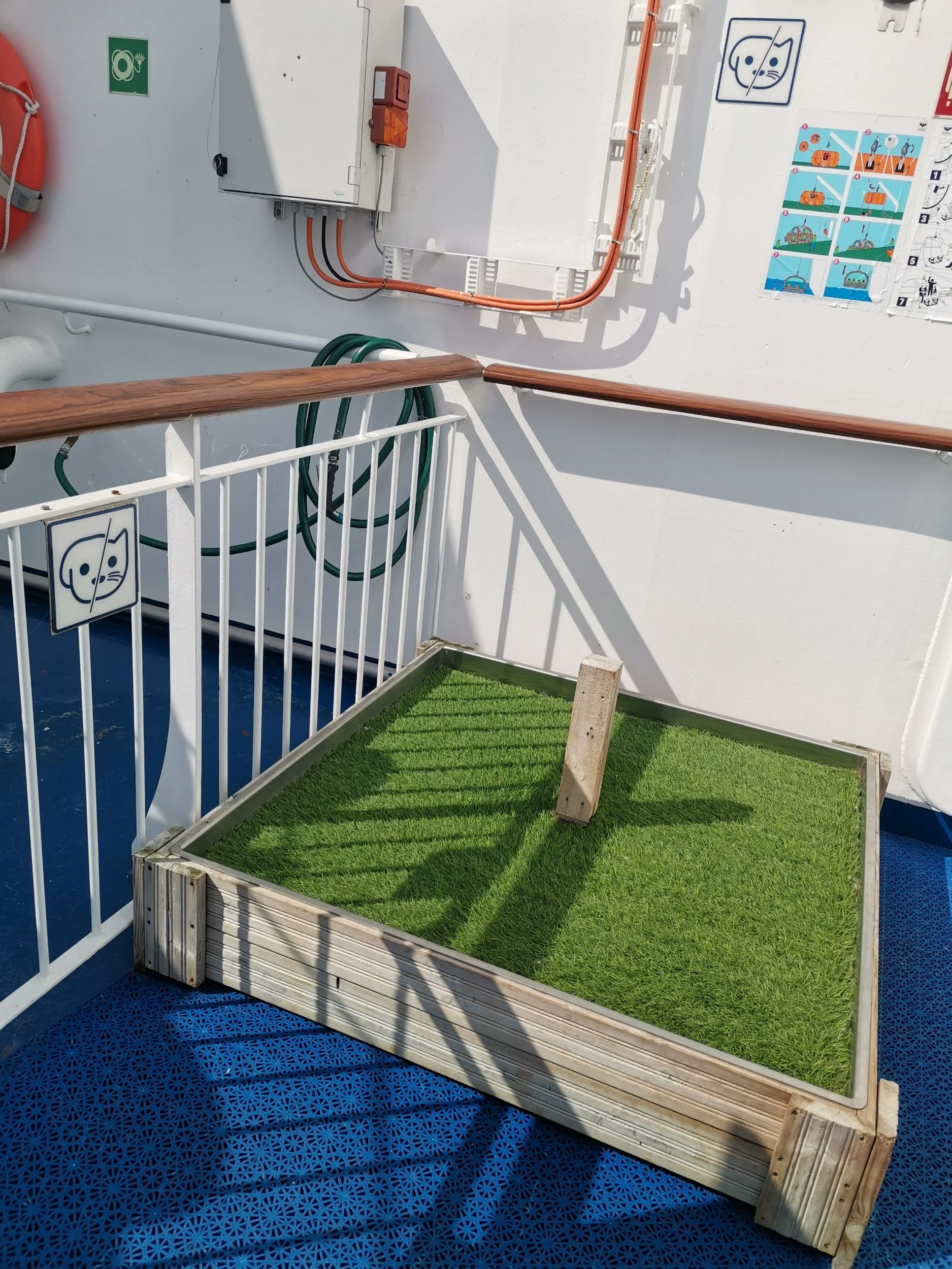 Ikke bare virket båten å være skreddersydd for hunder med en egen pet lounge, men jammen hadde de ikke fått seg et eget toalett ute på soldekket. Det som jeg først trodde var kongen i et Kubb-spill, viste seg nemlig å være en god, gammeldags (!) pissestolpe for bikkjer - lekkert og fristende dandert i ei kasse, med kunstgress rundt - for that natural feeling. Finnene vet å ta vare på kjøterne sine. Det skal de ha.