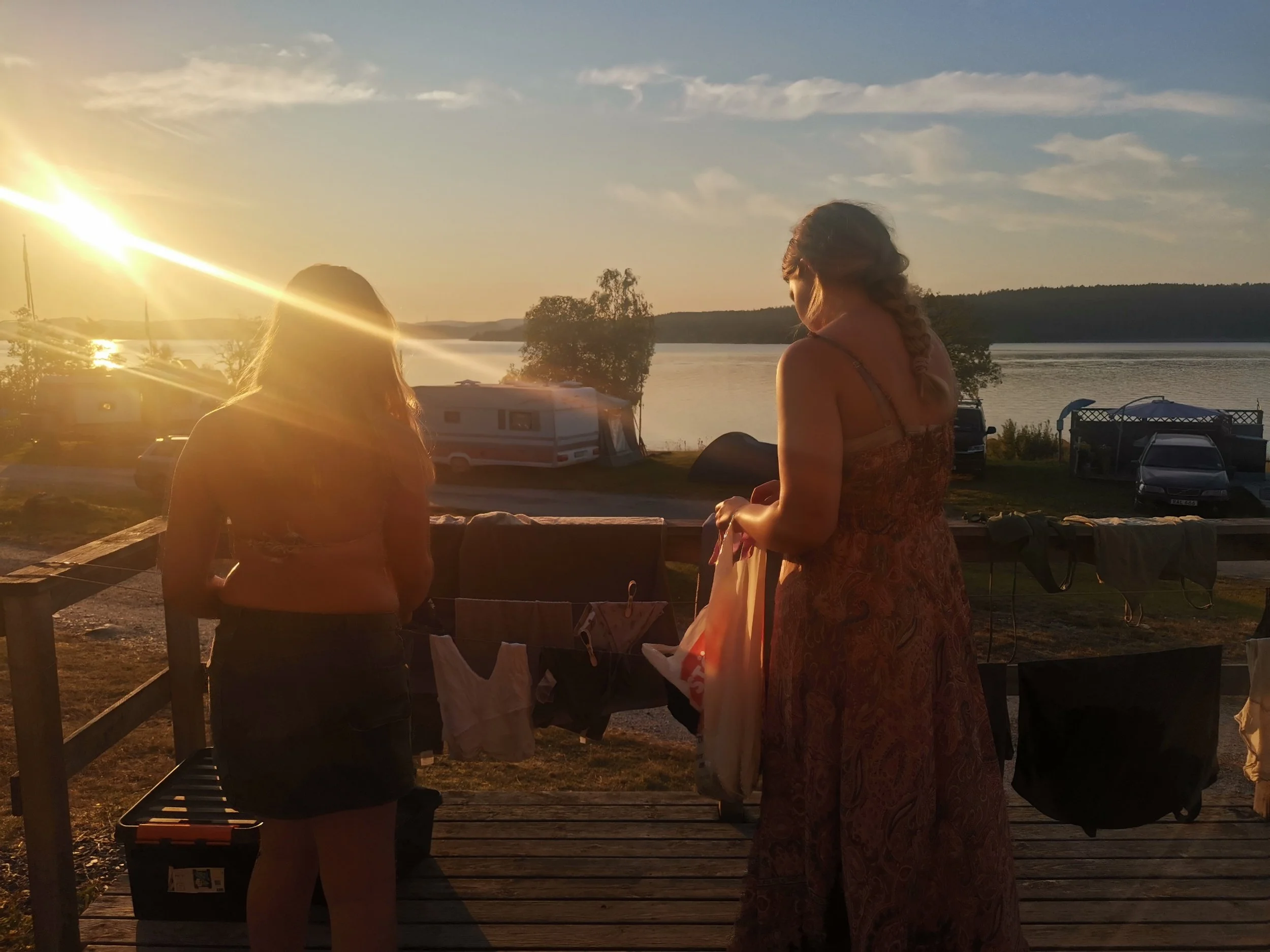 Vi tørket oss, og ruslet opp igjen til hytta, der 15-åringen koste seg på plattingen med ei bok. Så bar det opp igjen til servicehuset med klesvasken for å skylle ut såpa, før jentene sporty tok jobben med å henge opp vasken til tørk - på det høyst provisoriske tørkestativet vi hadde konstruert utenfor inngangsdøra. Fattern har alltid med seg ei lang klessnor med noen klyper i camping-boksen, og den kom virkelig til sin rett i kveld.