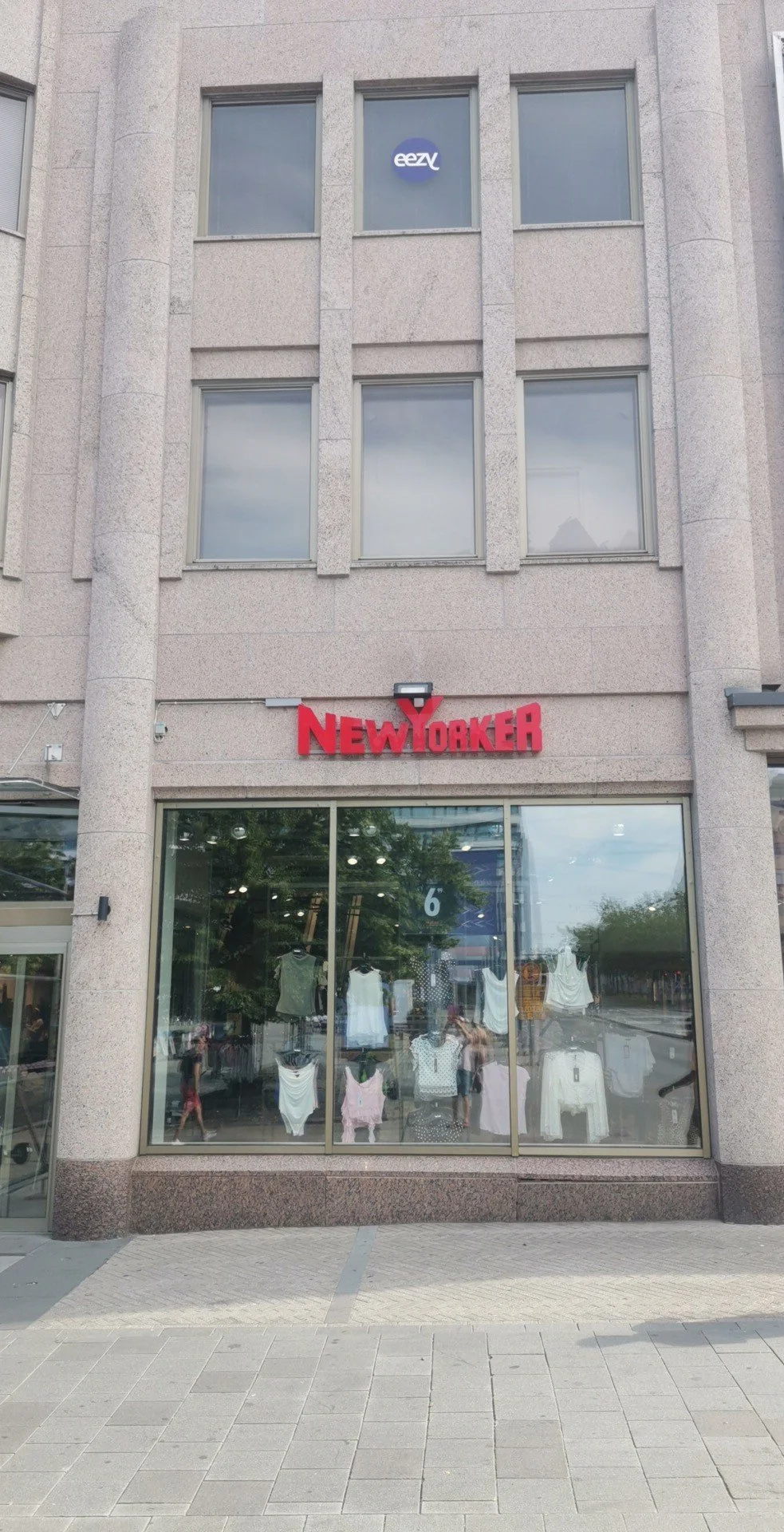 Etter å ha sendt kortet på reise til Norge, så tuslet vi bort til torget, der vi i går hadde gått forbi en da stengt New Yorker-butikk. Vi elsker alle tre New Yorker - det er billig og tålig bra kvalitet, og klærne er hakket kulere enn de du får på H&M og lignende.