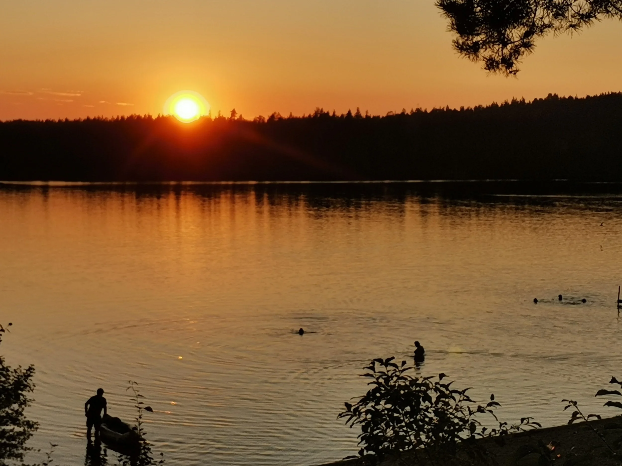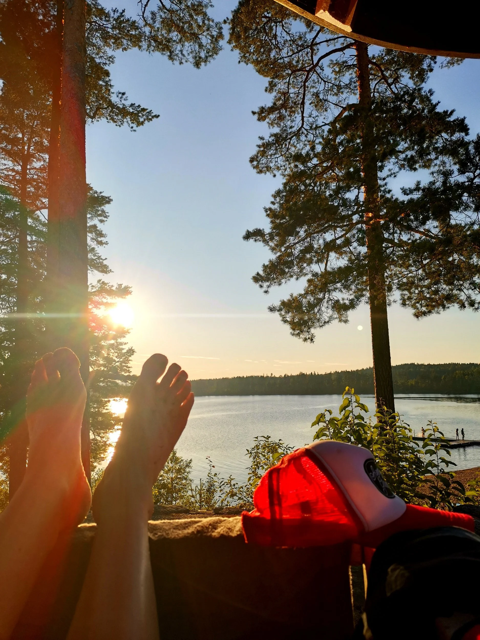 Vi hoppet uti alle tre, og nøt det svalende badet mot de varme skrottene våre. Så la vi oss for å tørke litt på et medbrakt strandteppe, før det var dags for runde nummer to. Sola var i ferd med å synke på himmelhvelven, så fattern presterte faktisk å fryse litt da han lå på teppet etter svømmetur nummer to. “Jeg kunne fint ha klart ytterligere 10 grader mer med varme, ass”, sa jeg med en kjølig skjelving i stemma. “Enig”, kom det fra begge de to jentene.