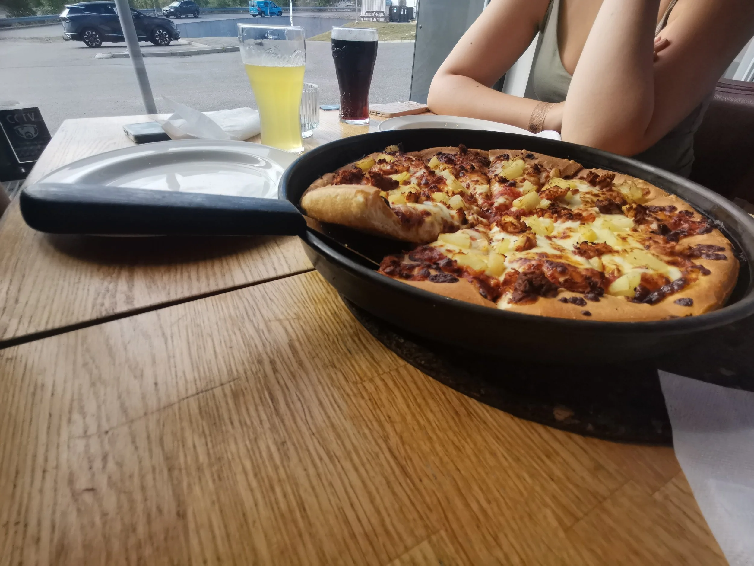 Vi gikk for en pizza med ananas og kylling, og etter et lite kvarter stod et lekkert serveringsfat på bordet. Dispenserbrusen kunne jentene hente selv, og som alltid så 11-åringen sitt snitt til å mikse og trikse med alle mulige smake i én.