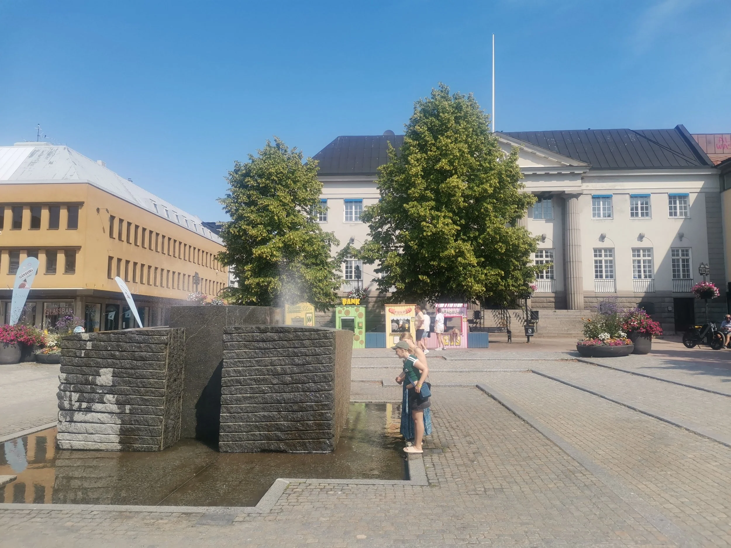 Vi ruslet i stedet i retning torget igjen, og smatt inn på Härnösand Konsthall, der de hadde en gratis, liten utstilling. Det var ikke veldig mye spennende å se, så runden gjennom de to etasjene gikk ganske så fort. Ute hadde en lokal, ung kunstnerspire satt opp fire staffelier, og inviterte barn til å male på lerret det man så, altså et eller annet motiv fra torget, folk som passerte, eller noe helt annet. Evelin hadde nok litt lyst, men hadde mer lyst til å komme seg inn et sted med aircondition - for nå kokte formiddagssola veldig.