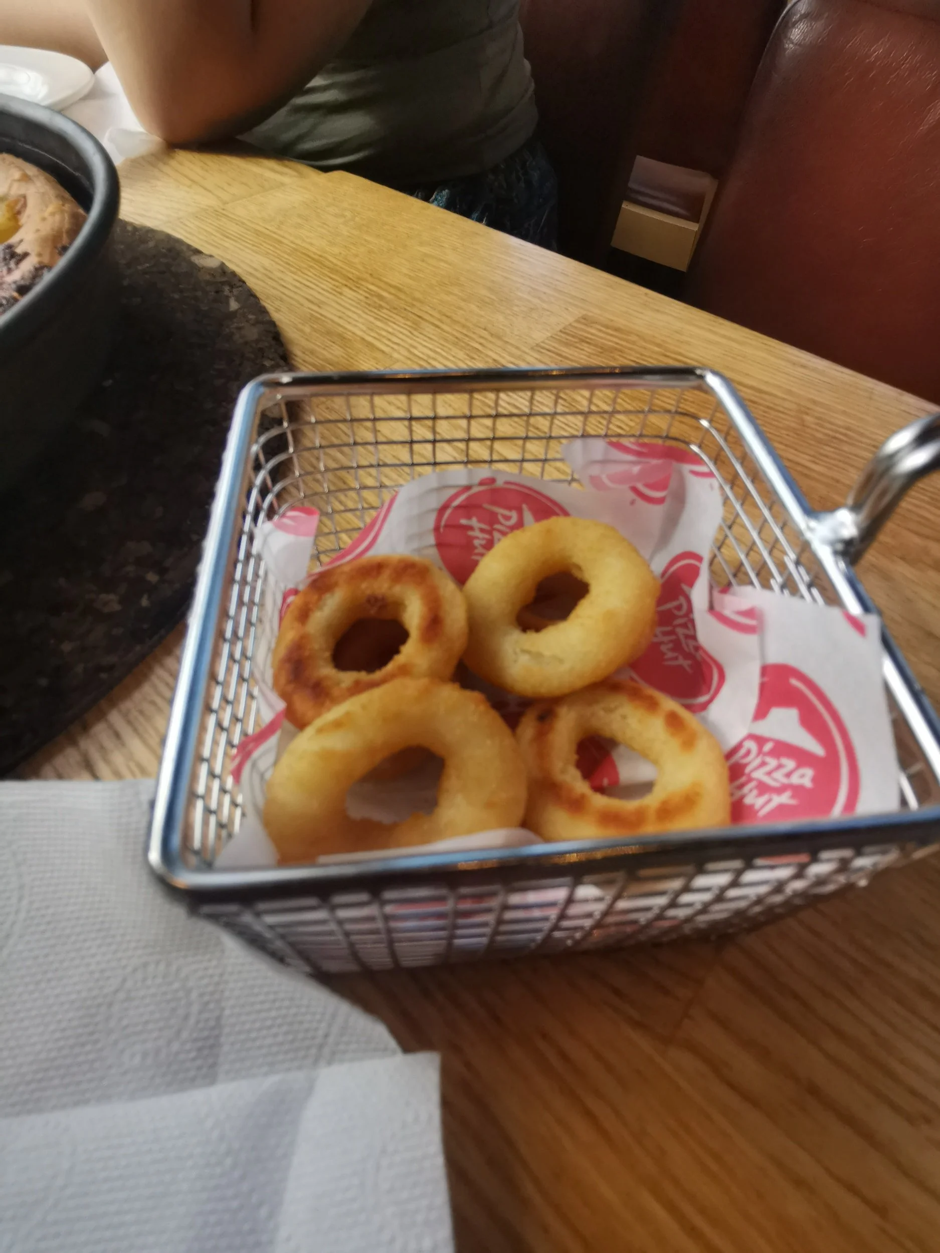 Konseptet her var fast food-enkelt. Du kunne kjøpe buffet i kassa, eller du kunne gå inn via en QR-kode på bordet, og se menyen forøvrig. Vi valgte det sistnevnte, og fant til slutt ut at vi skulle prøve oss på en kombo på menyen som var tilpasset 2 voksne: en stor pizza, seks løkringer og to kopper dispenserdrikke med påfyll.