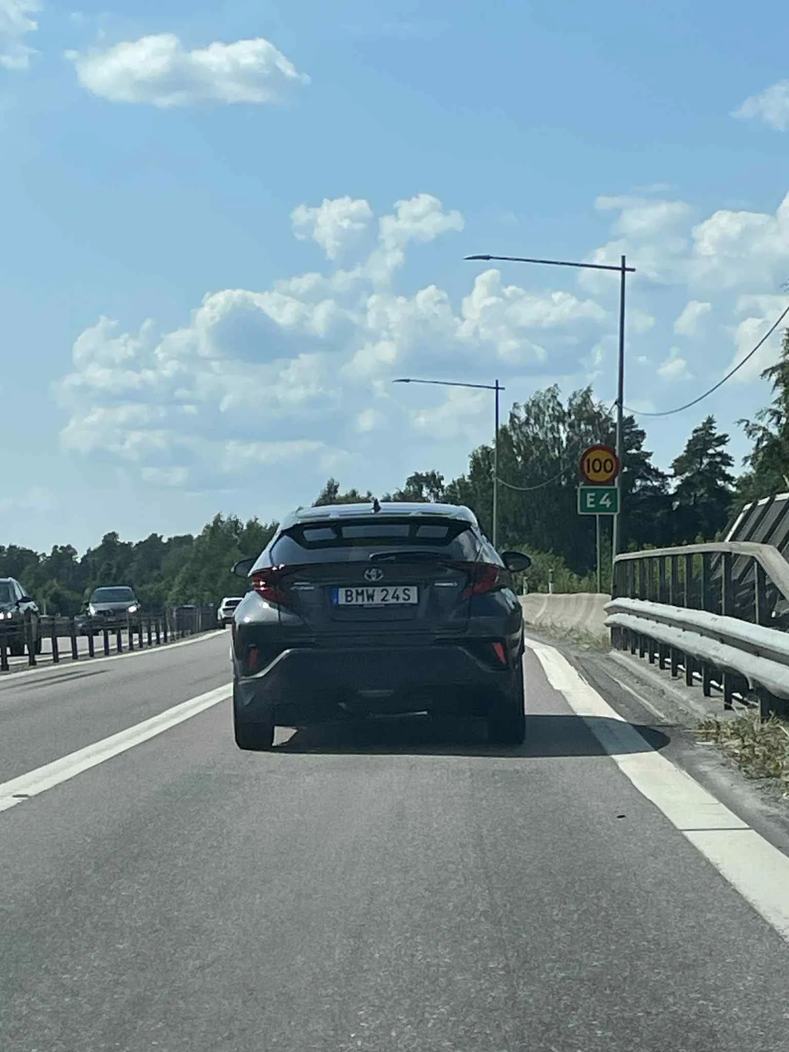 Gode og mette kom vi oss ut igjen på E4. For første gang på turen så vi nå også skilter til Stockholm, og plutselig føltes det som vi var lenger syd enn på ei uke. Det var vi også i det vi så Sundsvall forsvinne i bakspeilet, og hektet oss på en svensk Toyota som noe misvisende hadde fått BMW på kjennemerkene.