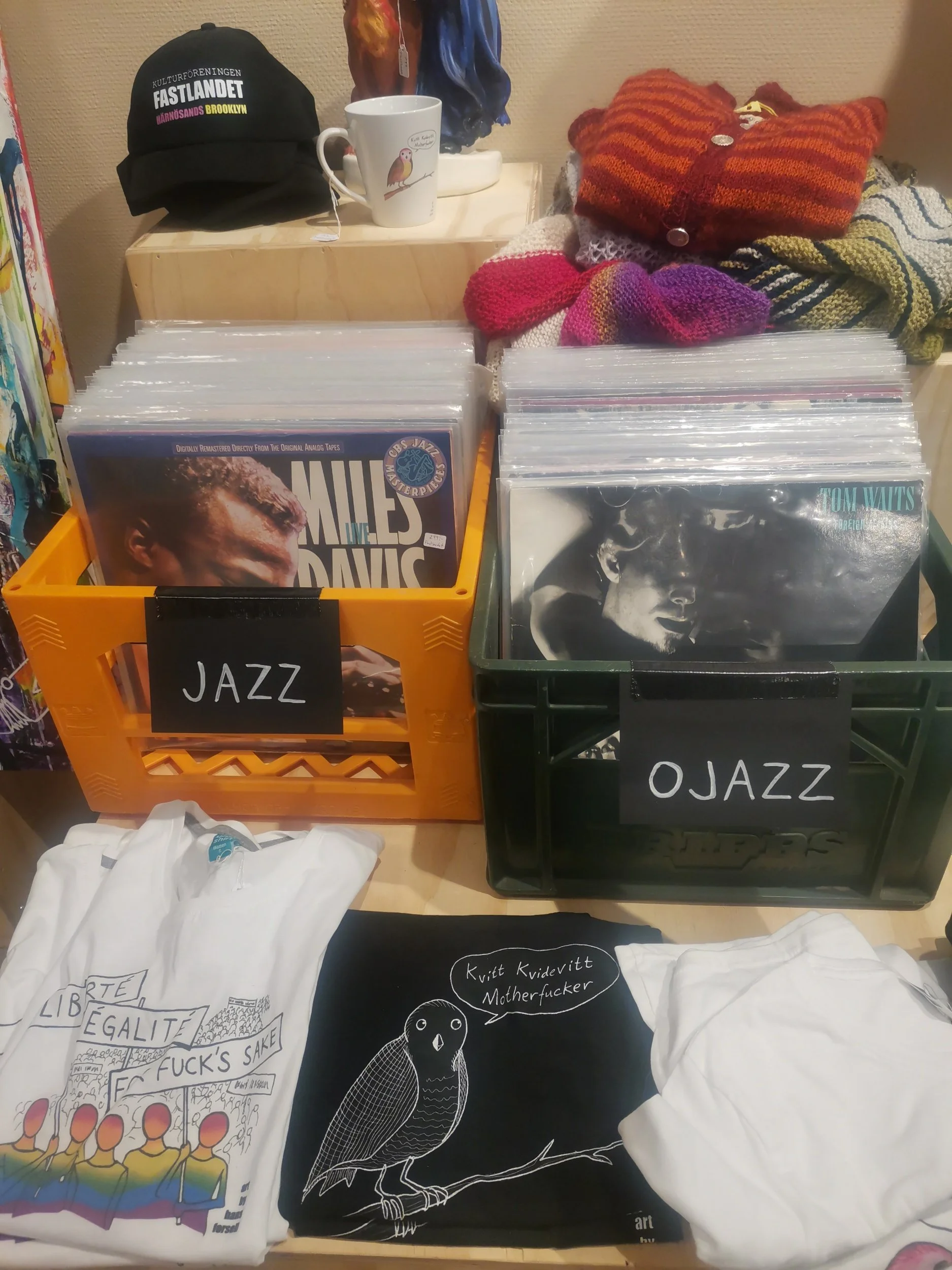 Fattern koste seg vel aller mest med den vesle vinyl-avdelingen innerst i en krok. De hadde gjort det enkelt, og sortert på jazz eller ojazz. Det enkle er ofte det beste, og det var ojazz-kassa som fristet fattern mest - uten at det ble noe kjøp her heller. En t-skjorte med teksten “Kvidd Kviddevitt Motherfucker” var nær ved å bli med hjem, men til prisen av ei natt på ei campinghytte, så stod jeg den av.