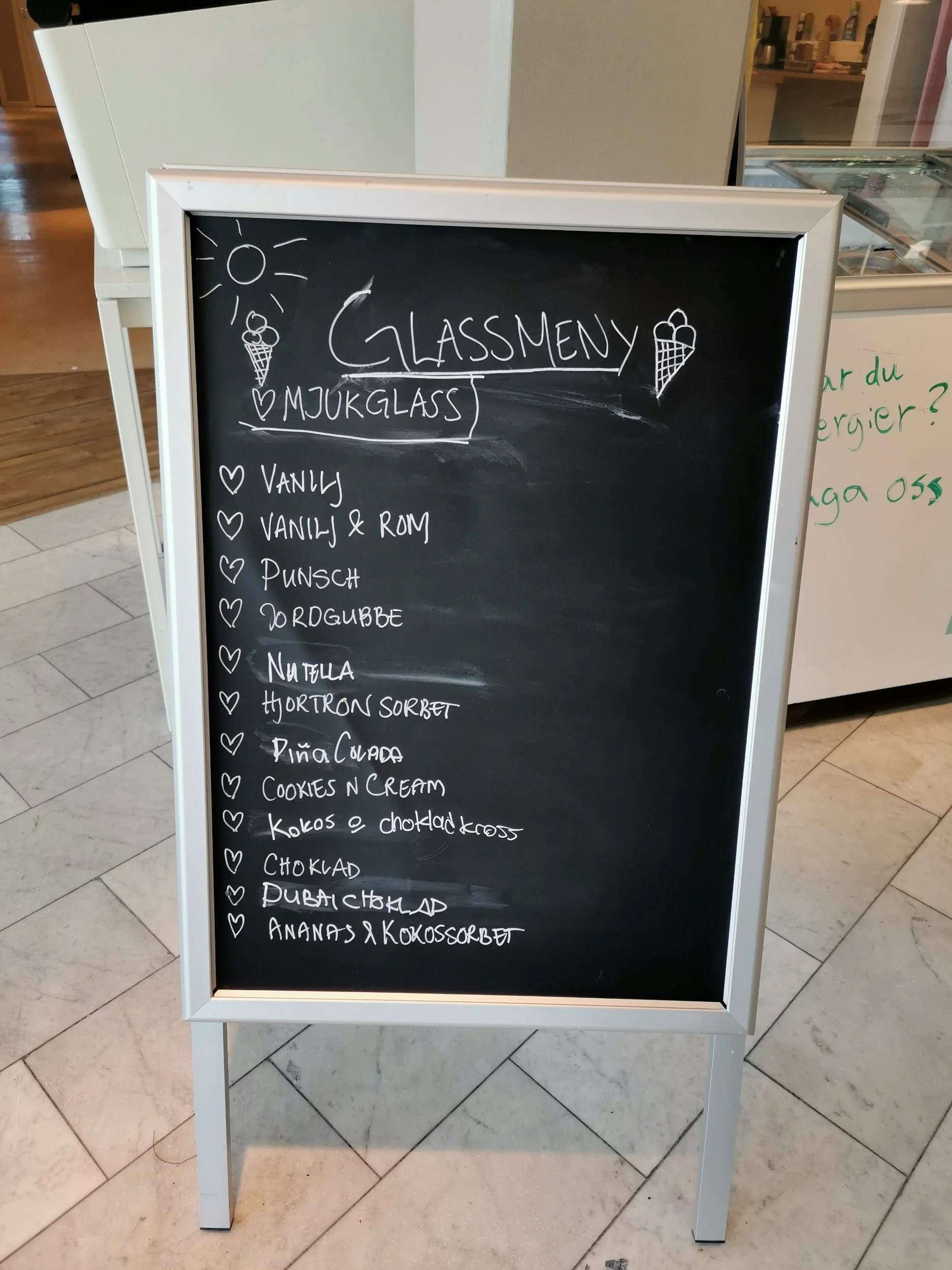Redningen fant vi på et gatehjørnet vis a vis Konsthallen, i Gånsvik glassbar. Det var en særegen liten iskafé, som kunne skilte med gult og kult interiør, og spennende smaker på kuleismenyen.
