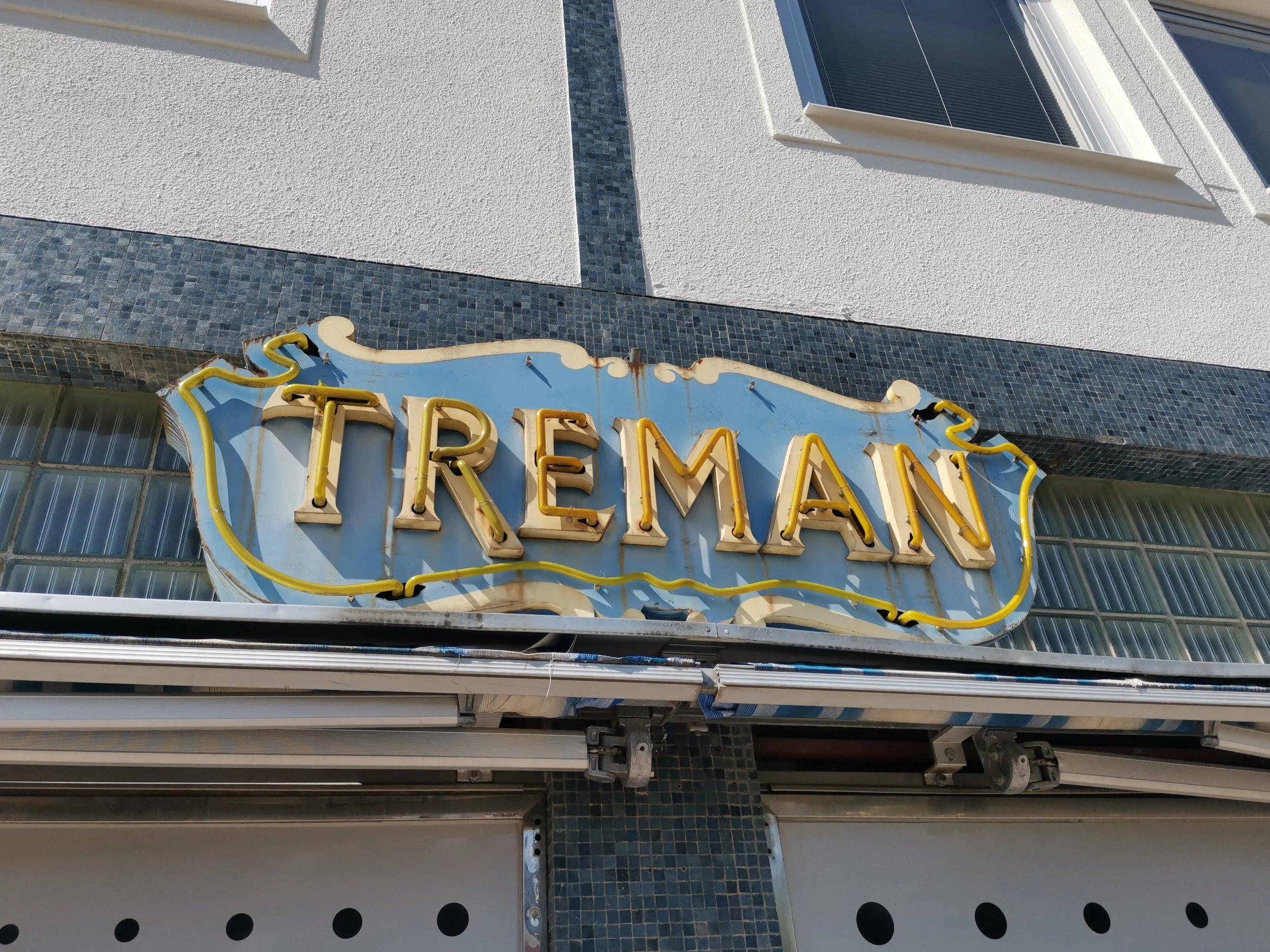15-åringen har fått en fascinasjon for gamle neonskilter akkurat som sin far, så vi delte samme entusiasme da vi gikk forbi flere minner fra en svunnen tid. Lillesøster skjønte overhode ikke hvorfor vi absolutt skulle feste gamle skilt på film, men det brød ikke to eldste seg nevneverdig om - og knipset i vei. Altså digitalt, da. Det er snart like lenge siden jeg tok bilder på film som det var lys i skiltet utenfor konfeksjonsbutikken Treman.