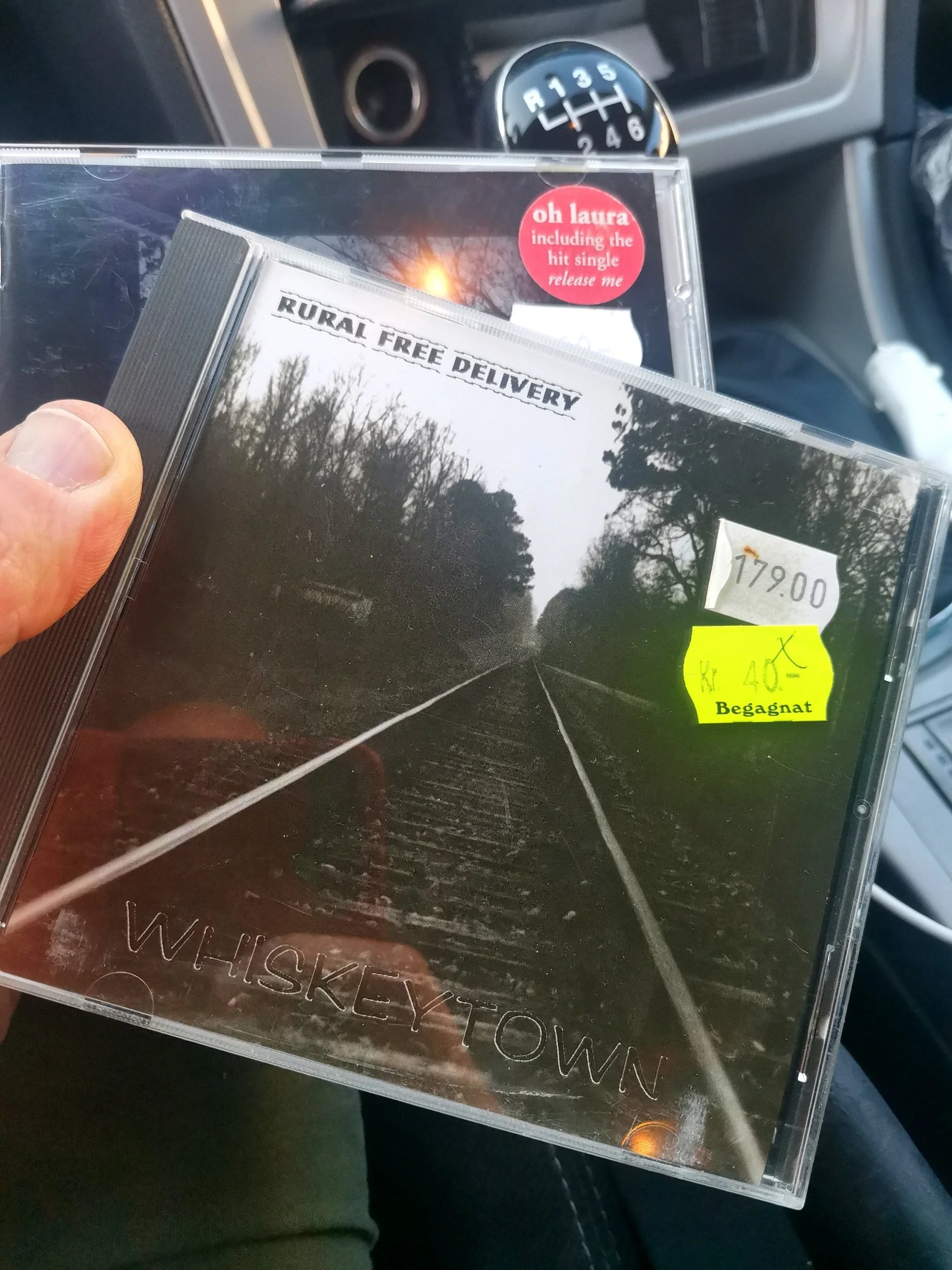 Mannen bak disken kikket opp, og sa at det ikke var noen bråhast. Han skulle allikevel være igjen litt i butikken, så han kunne si i fra når han ble lei oss. Vi takket for ekstra ti minutter, men valgte å respektere tiden hans såpass at vi da gikk til kassa. Iris kjøpte seg ei Abba-plate på vinyl, mens jeg endte opp med tre nye, gamle CDer til bilen - deriblant Whiskeytown sin EP “Rural Free Delivery”. På den skal det visst nok være et hemmelig bonusspor som er lagt først, som fordrer at du spoler tilbake når du starter spor 1. På turen har jeg opplyst Iris om magien med hemmelige spor, og siden debutplata til Marry Me Jane, med filmmusikken fra If Lucy Fell også har vært med oss på tur, så har jeg både delt historier om hvor skremt jeg har blitt av bonussporet lang etter siste låt, og fått demonstrert det i praksis - da vi på en eller annen strekke glemte av at plata var “ferdig”, og plutselig skvatt til alle som én.