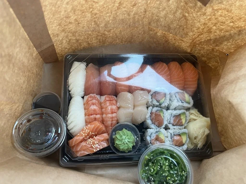 Jeg insisterte på at det måtte bli Sushi. P konfererte med crewet sitt i KG, og vi landet på å ringe inn en bestilling til Strømmen sushi, og legge inn en liten detour fra E6 nord for hovedstaden.