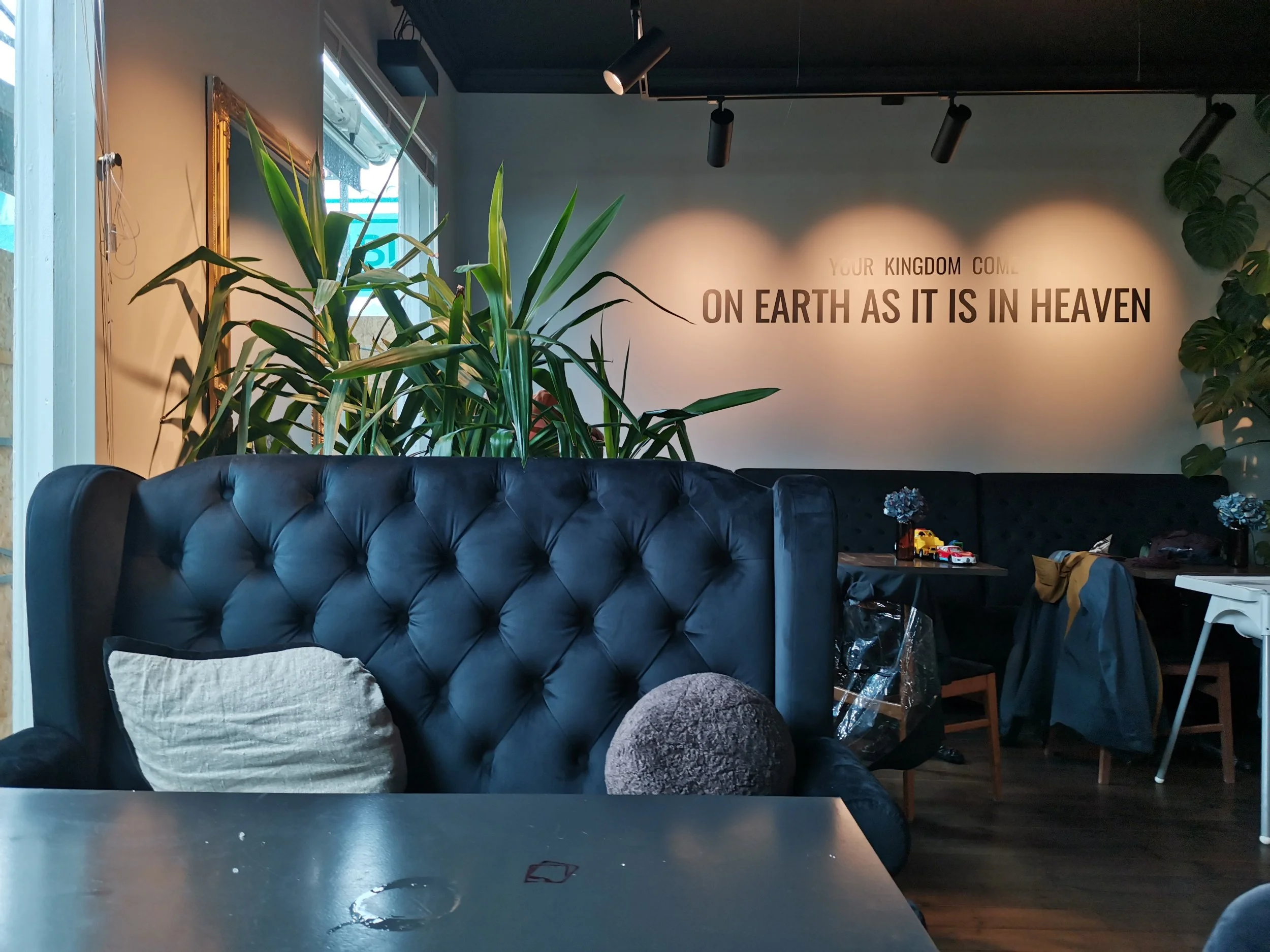 Vi begynte ganske snart å bli litt sultne igjen etter frokost, og stoppet på i Flekkefjord, der vi fant oss en kafe midt i bibelbeltet. Den het til alt overmål Englevakten, og var fylt til randen av bibelsitater og til og med kristenmusikk på dass.