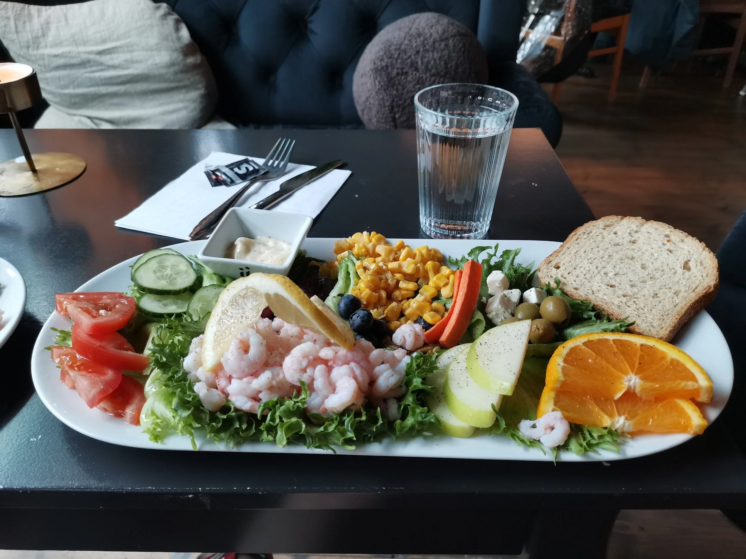 Rekesalat og prissetting hadde de imidlertid peiling på. En kvart tusenlapp pr. porsjon salat gir penger i kollekten, men vi var godt fornøyde med både smak og utvalg - ja, rent bortsett fra at de nok hadde falt for fristelsen å bruke reker i lake, da. Den hadde jeg ikke sett komme her nede på tjukkeste sørvestlandet.