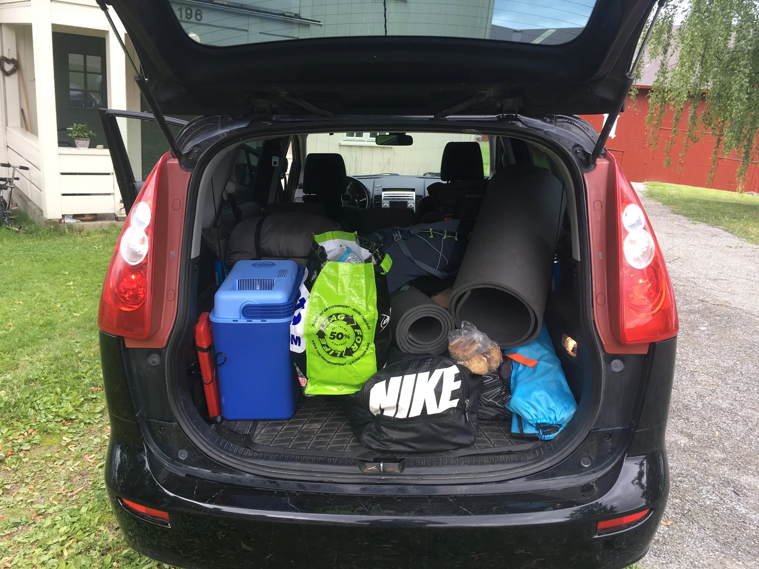 UF'en er lastet med telt, stol med koppholder, liggeunderlag, sovepose, fiskestang, harpe (ikke instrumentet!), hjulvinne, kortstokk, kokeapparat, gass til kokeapparat, et par ekstra sko, ei kartbok, et par slipperser, solkrem, regntøy, NAF-medlemskortet, et kamera, GPS, søppelsekker, en sekk og en bag med klær.