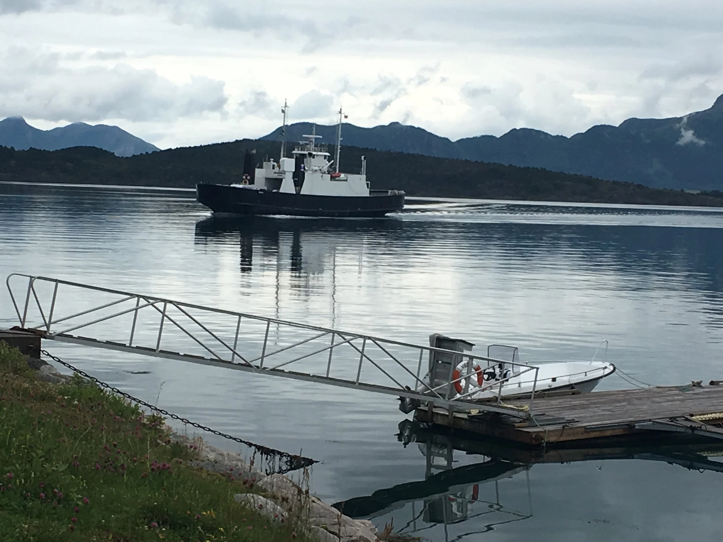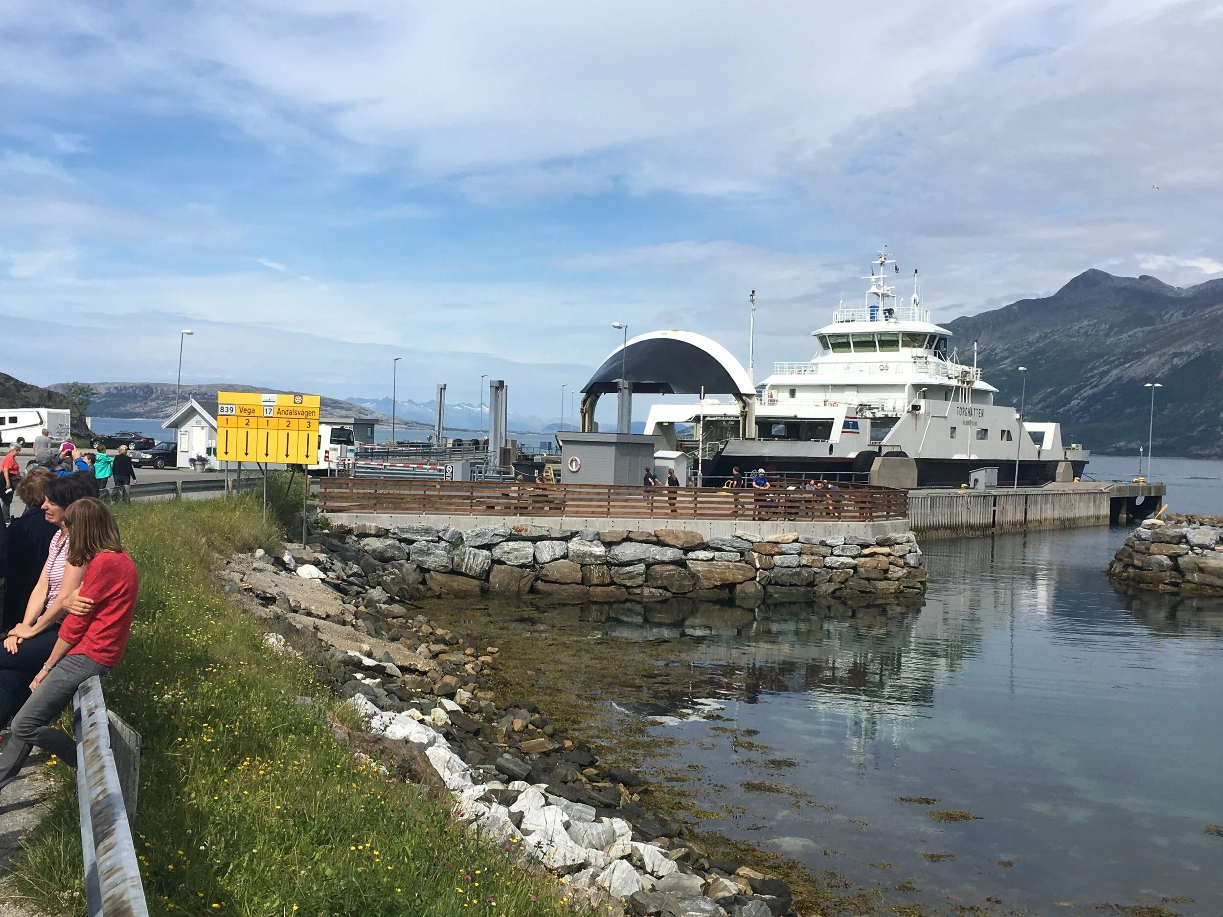 Der og da bestemte jeg meg, ikke overraskende, for å forandre planen. Hvis jeg dro rett til Holm, så var sjansene store for at jeg kom med 16-ferga til Vega. Sola stakk fortsatt frem fra blå himmel, og jeg kunne være heldig med overfarten. Så tenkt. En god halvtime senere stod jeg i fergekøa til Vega. Fortsatt sol. Jeg kjøpte billett av den 16-år gamle sommerhjelpa, som løp i strikk mellom bilene fordelt på fem filer - hvorav tre skulle videre på RV 17, men de to til venstre skulle til Vega. Jeg parkerte bilen bak en lyseblå campingbil jeg også så på den forrige ferga, og valset opp i salongen.
