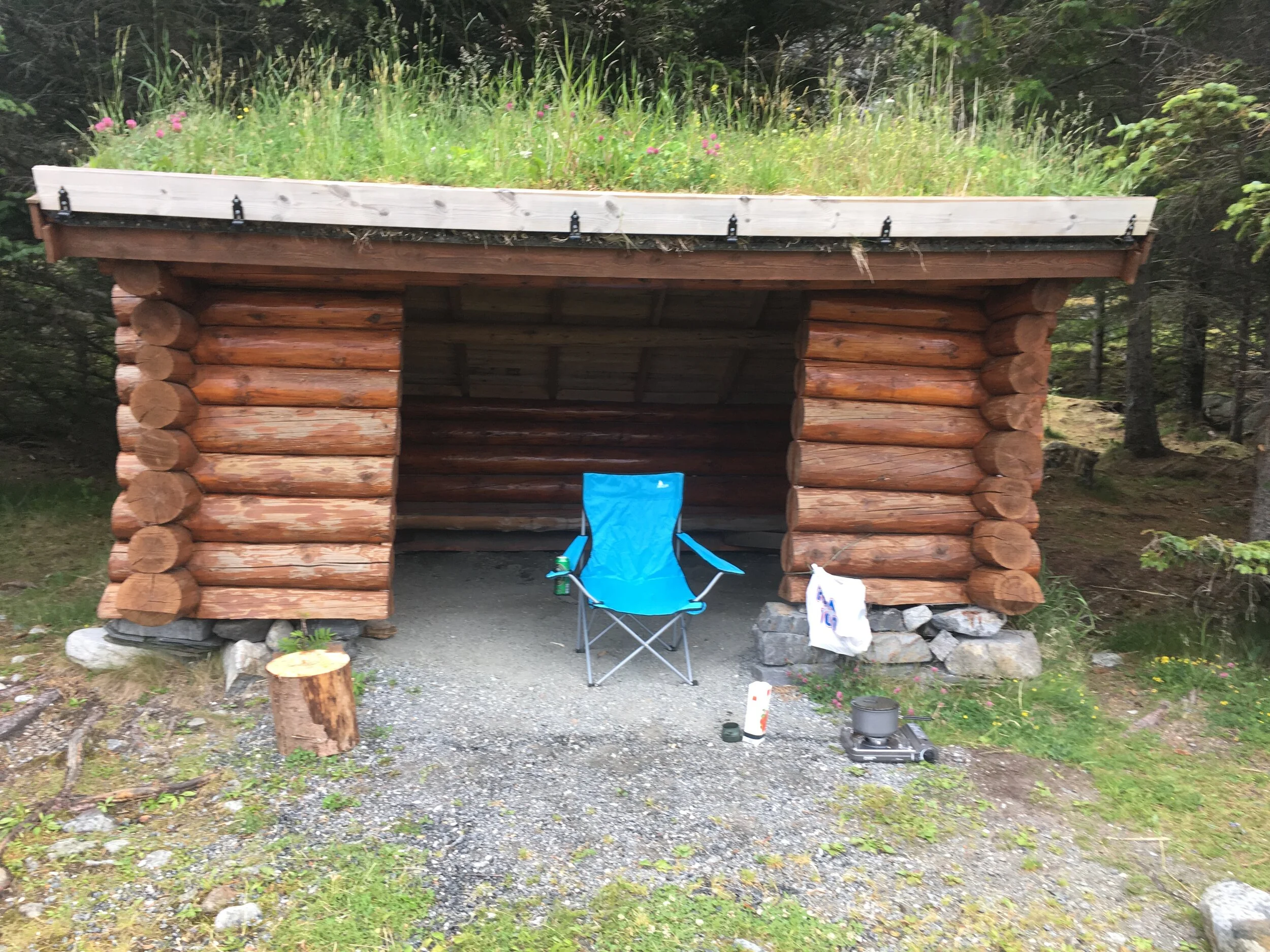 Jeg kjørte så langt jeg kom, og da oljegrusen sluttet så stoppet jeg for å lese på infoskiltet som stod der veien gikk over til en smal grusvei, mot noen gårder. Det hele så unektelig veldig privat ut. Men jeg var på rett vei, så jeg tok sjansen og passerte et par gårdstun før veien snirklet seg langs den sørlige kysten av Vega. Havet hadde trukket seg tilbake, og lagt igjen et bredt felt med sand, tare og steiner. Jeg kjørte forbi en annen parkert bil, en provisorisk fotballbane, en do og en sandvolleyballbane. Der veien stoppet, rett ved en skogkrull, lå det en flott, i ganske nybygd lavvo i trevirke. "Perfekt", tenkte jeg. Her kan jeg lage middag!