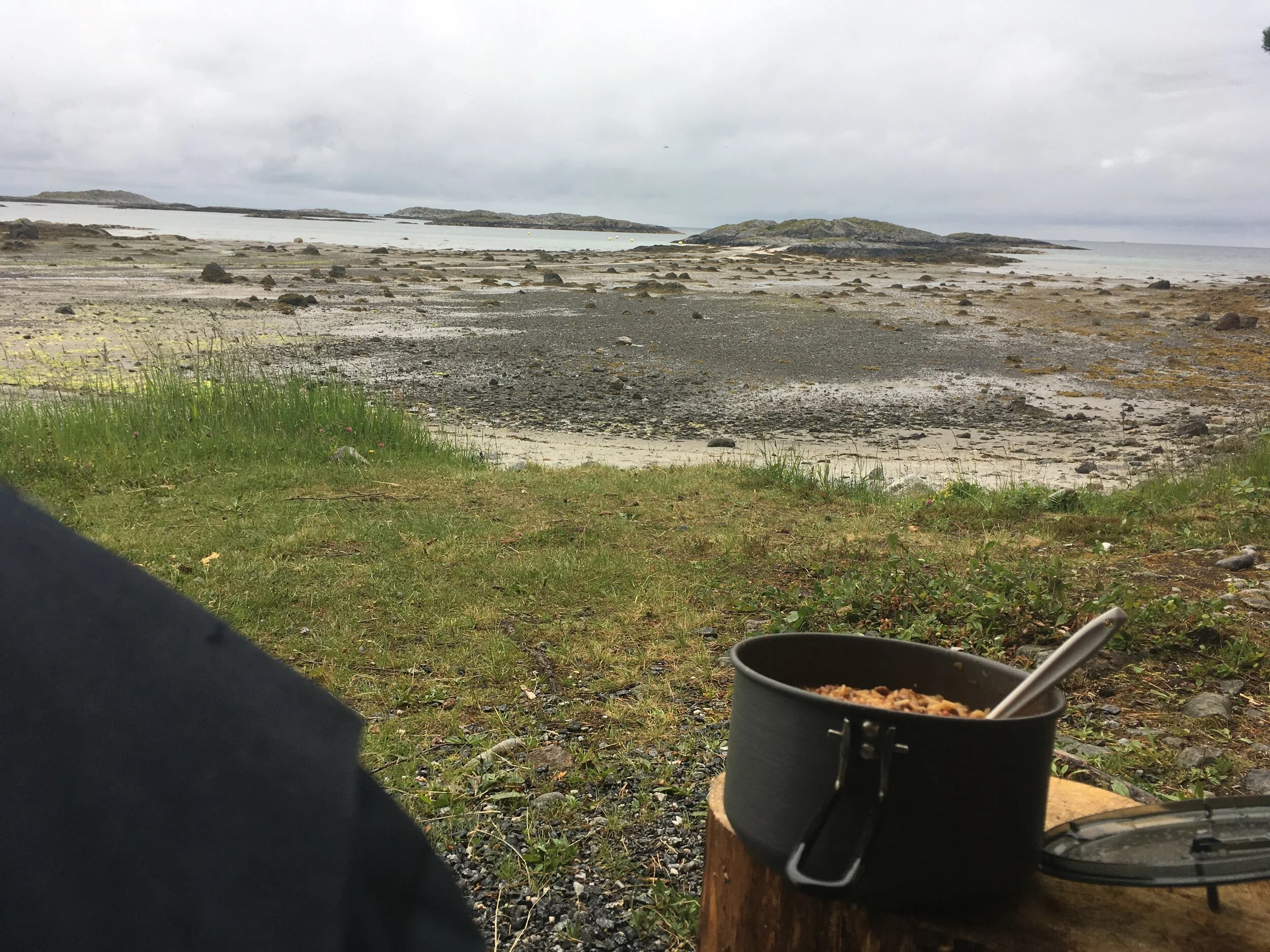 Jeg nøt måltidet og utsikten mot det åpne havet, bak skjær og holmer. En fantastisk stillhet utenom de herligste naturlyder. En bekk som bruste, og fugler som kvitret. Nå som regnet også hadde sluttet så bestemte jeg meg for å også slå leir her.
